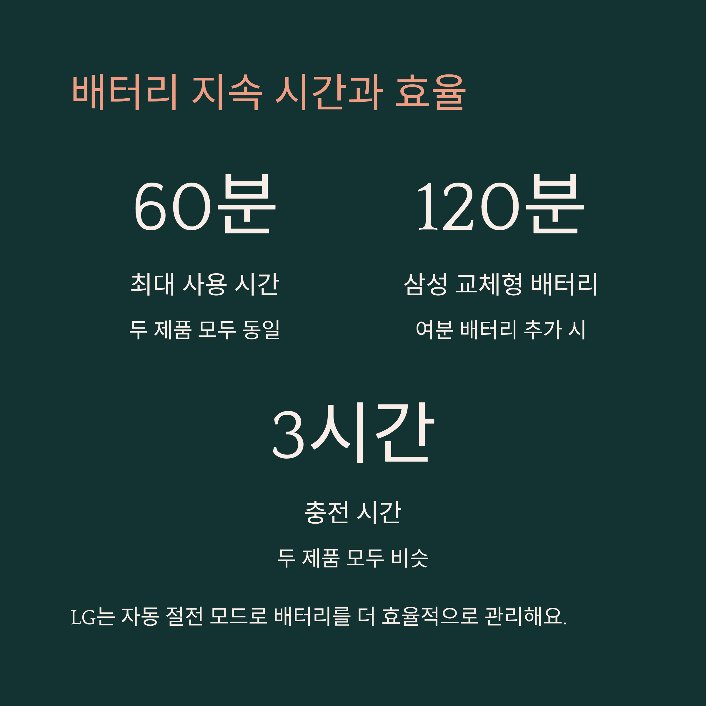 배터리는 ‘교체 유무’와 ‘스마트 절전’ 기능을 기준으로 보면 돼요. 자주 길게 청소한다면 삼성, 짧고 효율적으로 쓴다면 LG가 딱이에요!