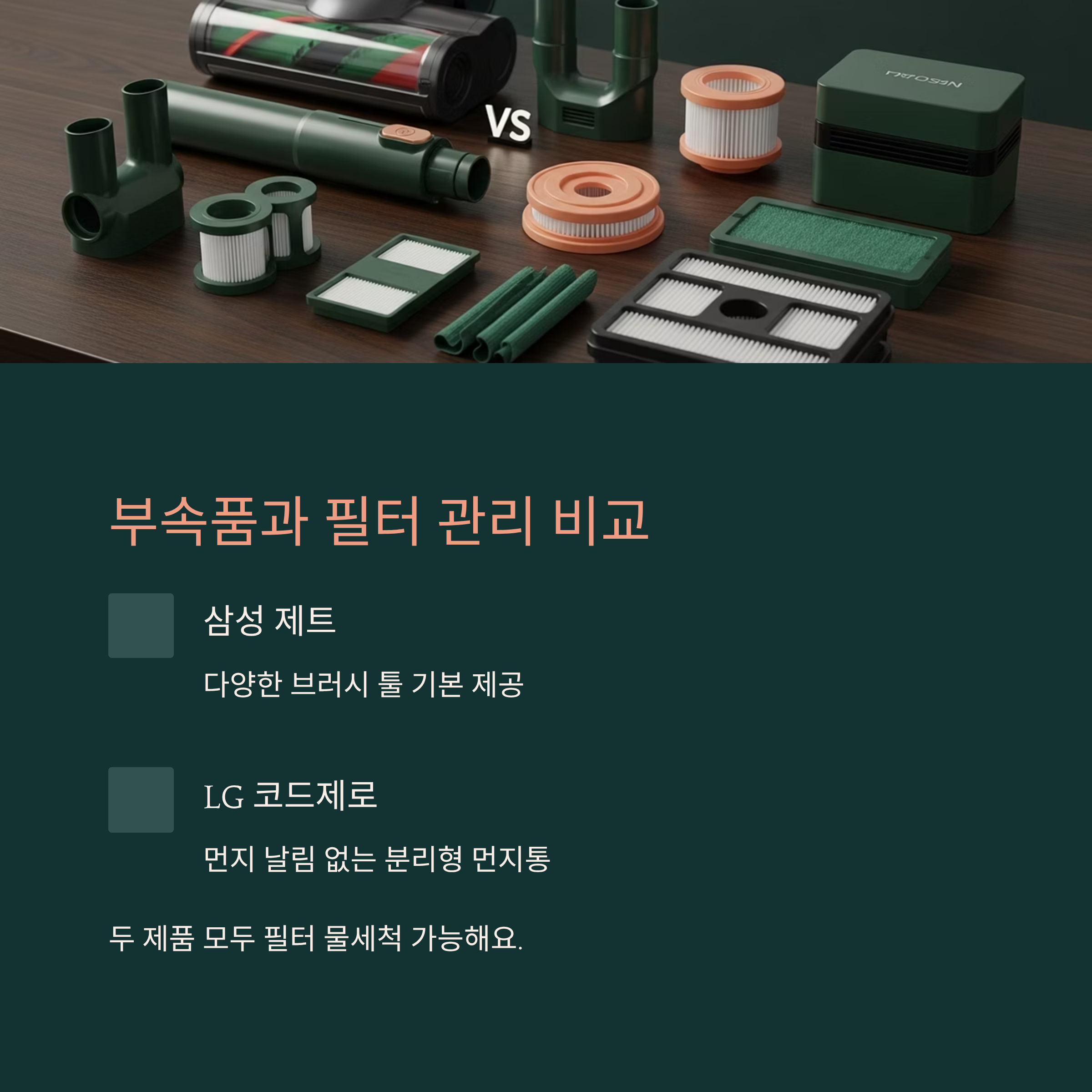 브러시 종류나 필터 관리의 편의성만 보면 삼성은 다채롭고, LG는 직관적이에요. 집에 반려동물이 있거나, 커튼·소파까지 청소하고 싶다면 삼성 쪽이 조금 더 다양성을 제공해요.