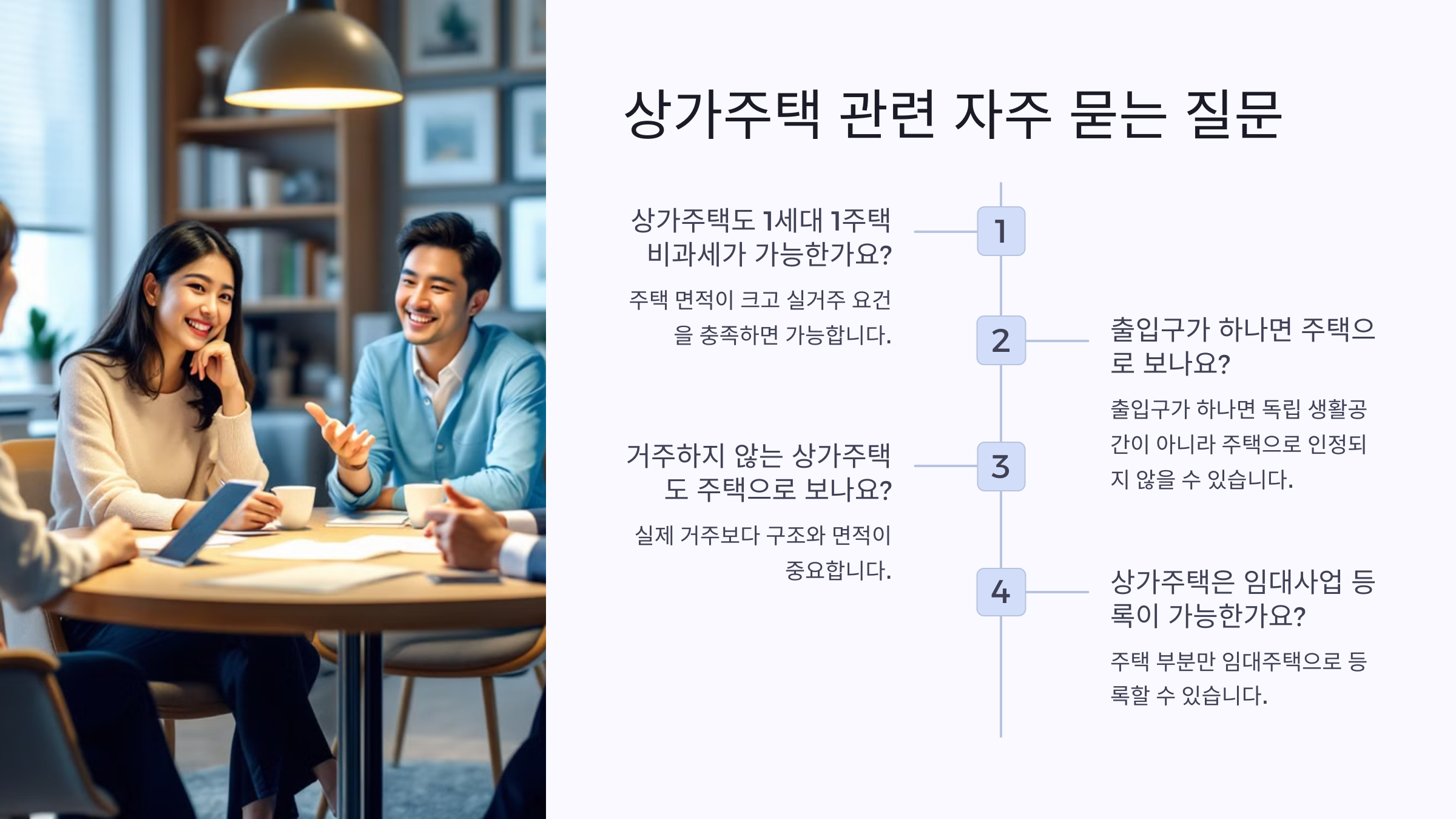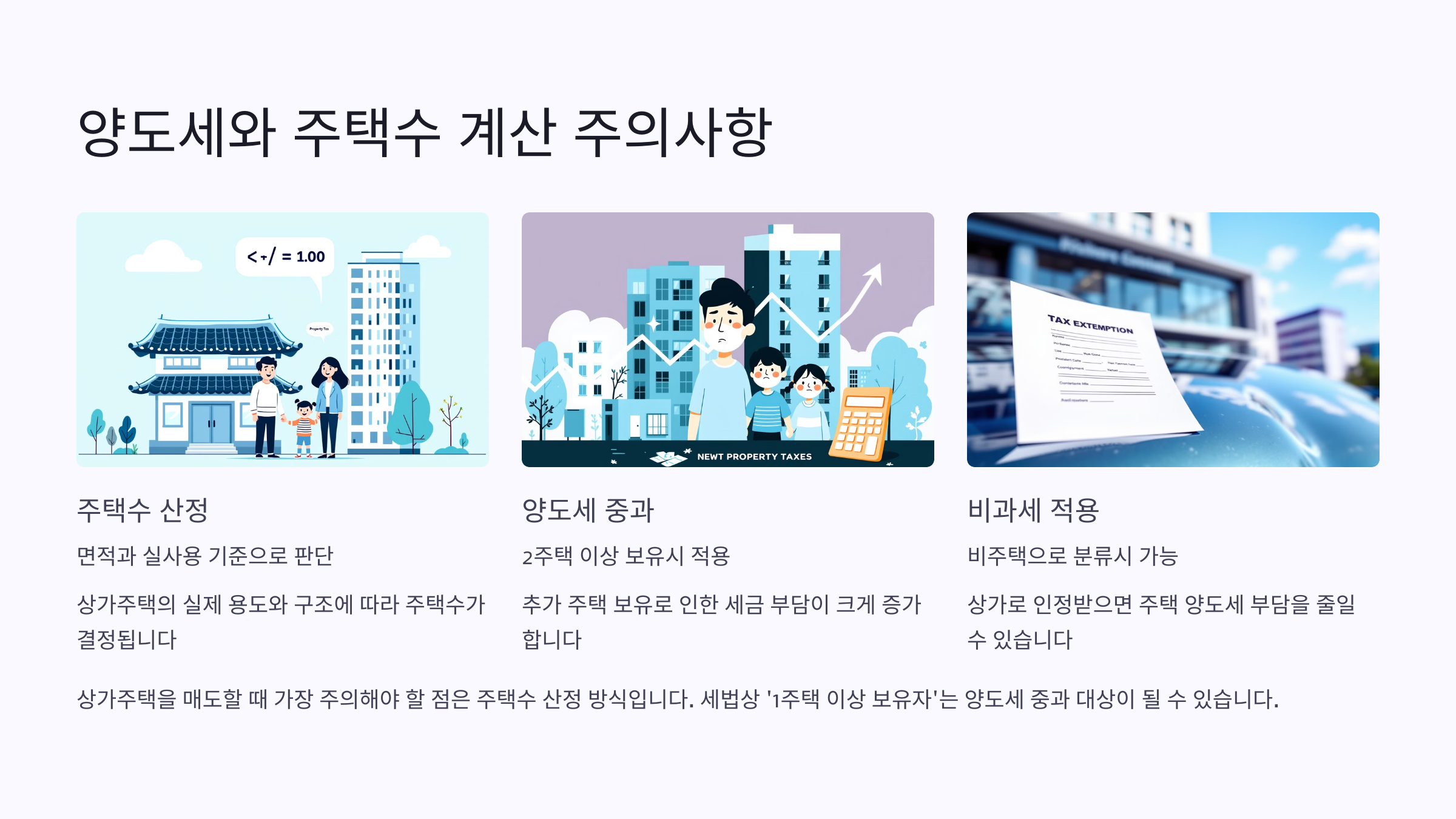 일부 상가주택은 '주택처럼 보여도' 주택으로 간주되지 않아, 기존 보유 주택과 합산되지 않아요. 예를 들어 상가 위에 창고처럼 사용하는 공간이나, 간이 숙소 수준으로만 사용되는 공간은 주택 수에 포함되지 않을 수 있어요.