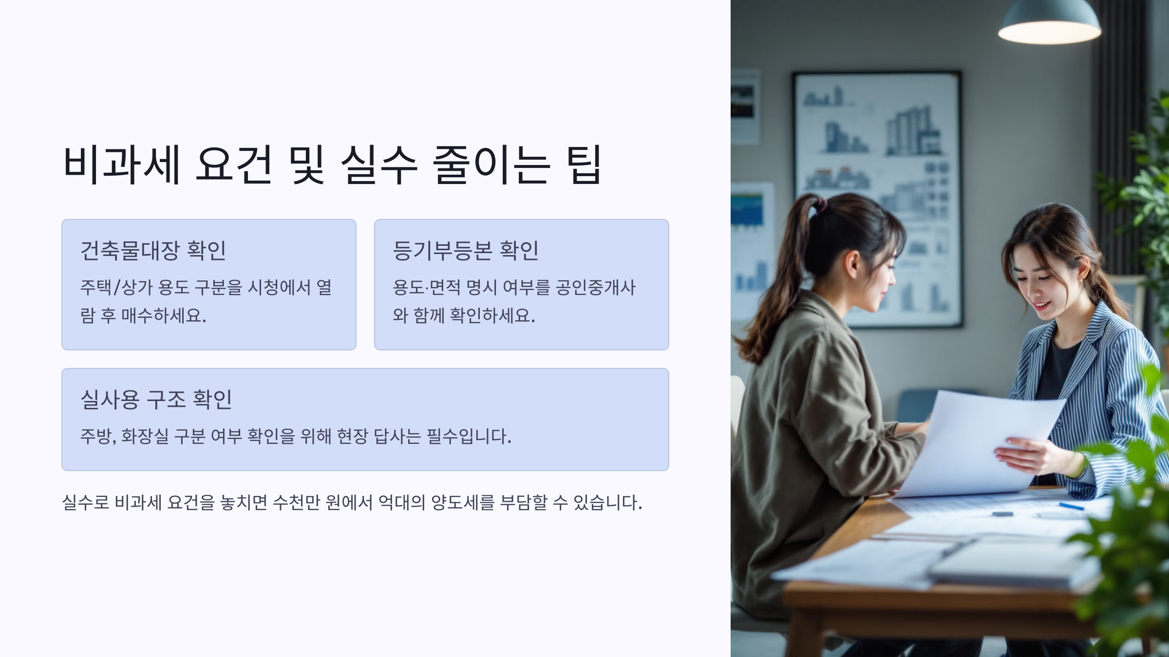 실수로 비과세 요건을 놓쳐버리면, 수천만 원에서 억대의 양도세를 부담하게 될 수 있어요. 계약 전 미리 확인해야 할 서류는 건축물대장, 등기부등본, 공시가격 등이고, 특히 ‘용도’ 항목을 주의 깊게 봐야 해요.