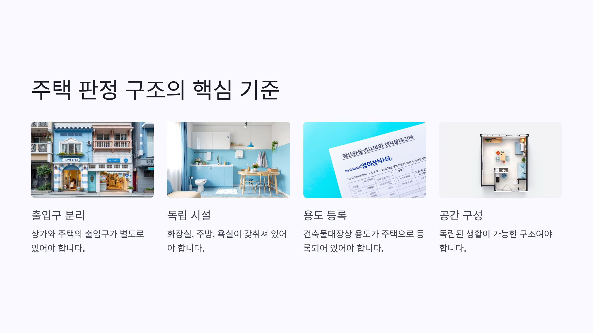 중요한 건 '외부 출입구의 분리 여부'예요. 출입구가 상가와 주택이 분리돼 있고, 공간도 나뉘어 있다면 주택으로 볼 수 있는 가능성이 높아요. 반대로 출입구가 하나거나 주거공간이 상가와 뒤섞인 구조는 주택 판정에서 제외될 수 있어요.