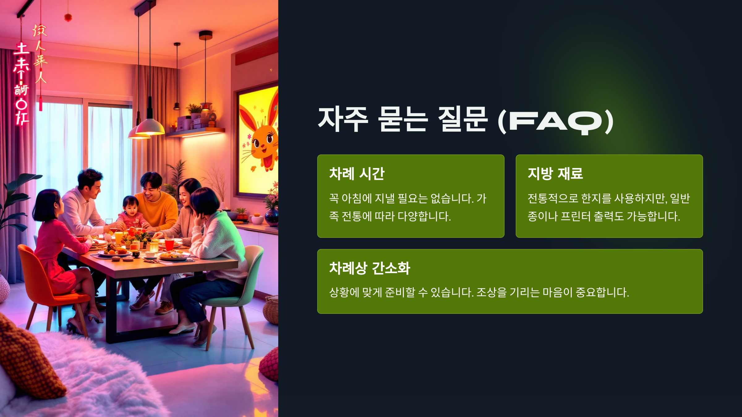 A1. 꼭 아침에 지낼 필요는 없어요. 지역과 가족의 전통에 따라 저녁에 지내는 경우도 있어요. 중요한 것은 조상에 대한 마음가짐이에요.