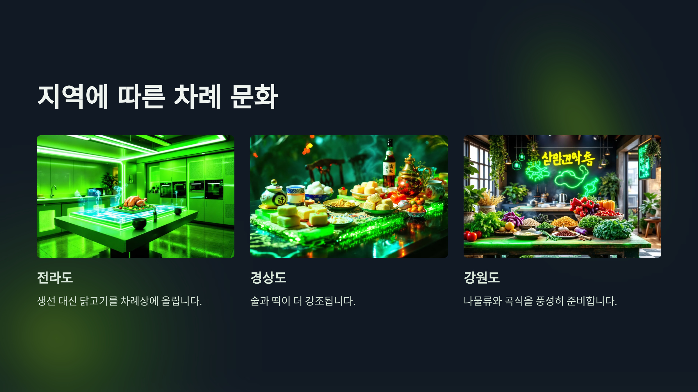 한국은 지역에 따라 차례를 지내는 방식이 조금씩 달라요. 예를 들어, 전라도에서는 생선 대신 닭고기를 차례상에 올리는 경우가 많아요. 경상도에서는 차례상에 술과 떡이 더 강조되며, 강원도에서는 나물류와 곡식을 풍성히 준비하는 특징이 있어요.