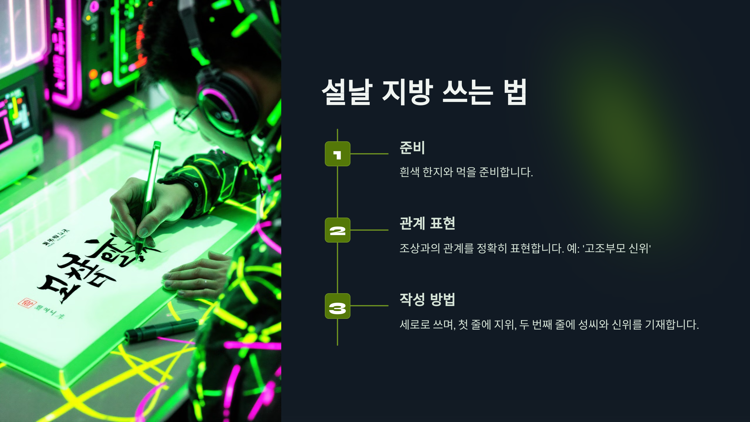 설날 지방을 쓸 때는 몇 가지 중요한 규칙을 따라야 해요. 우선, 흰색 한지와 먹을 준비하고 조상과의 관계를 정확히 표현해야 해요. 예를 들어, 고조부모님께 차례를 지낸다면 '고조부모 신위(高祖父母 神位)'라고 써요. 성씨를 적을 때는 일반적으로 조상의 본관을 포함하지 않고 간단히 표기해요.