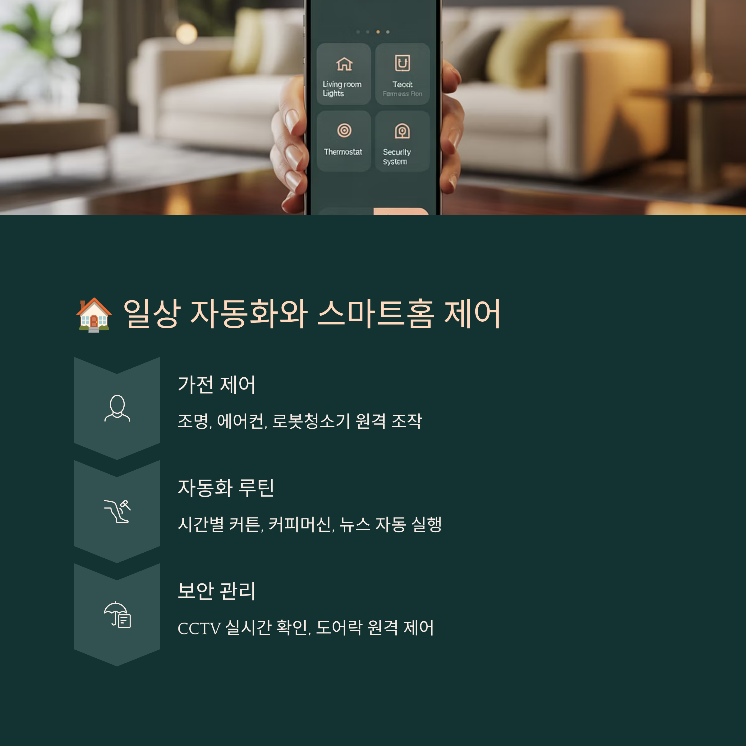 스마트폰은 이제 집 안의 모든 것을 제어하는 리모컨이 됐어요. 커튼을 여닫고, 조명을 끄고, 에어컨과 보일러를 조절하고, 로봇청소기를 돌리는 것까지 손 하나 까딱하지 않아도 가능하죠. 이 모든 게 스마트폰 하나로 연결돼서 '자동화된 집'을 현실로 만들어주고 있어요. 📱✨