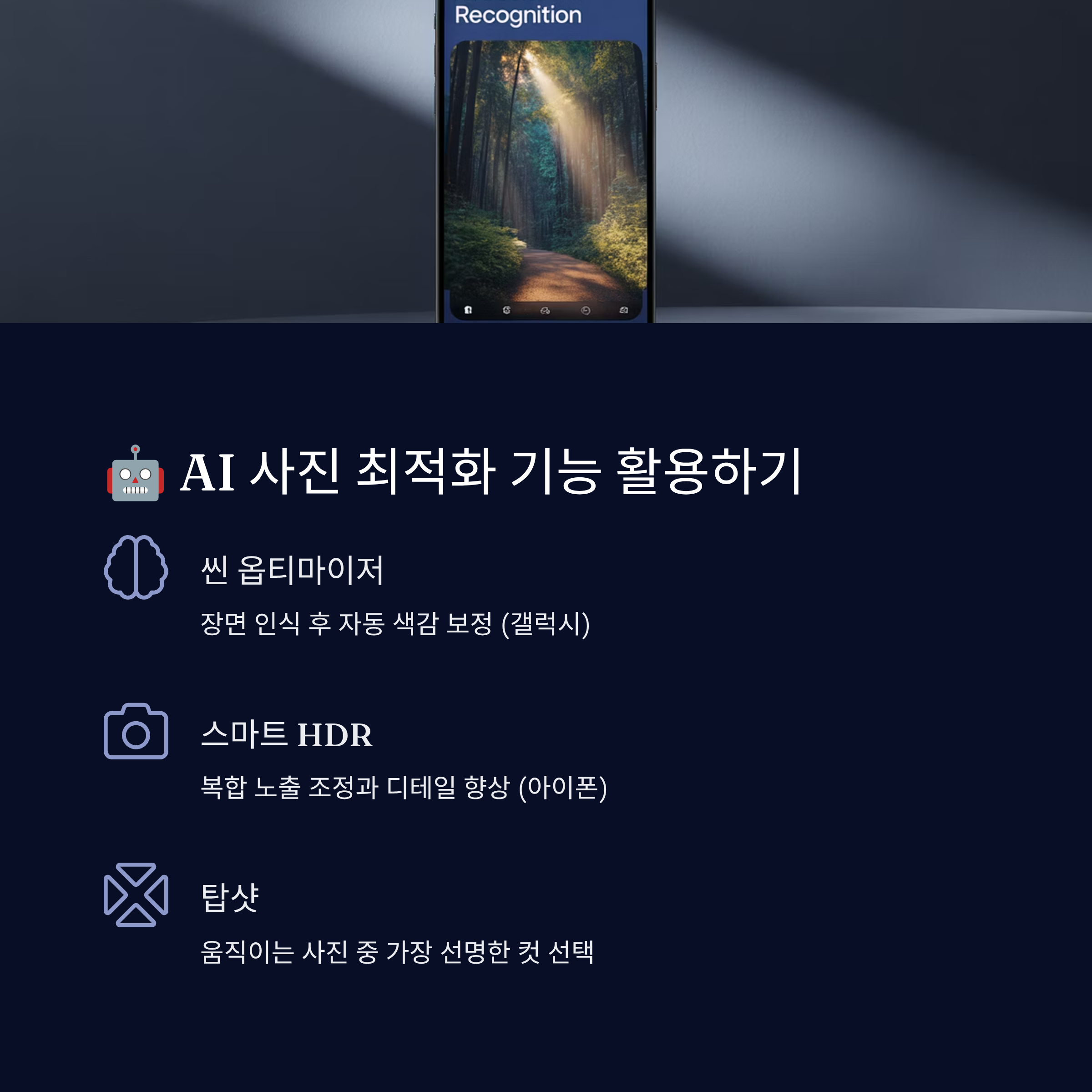 최신 스마트폰들은 AI 기반의 사진 최적화 기능을 탑재하고 있어요. 피사체를 자동으로 인식하고, 장면에 따라 밝기·채도·노출 등을 조절해주기 때문에 초보자도 전문가처럼 사진을 찍을 수 있어요.