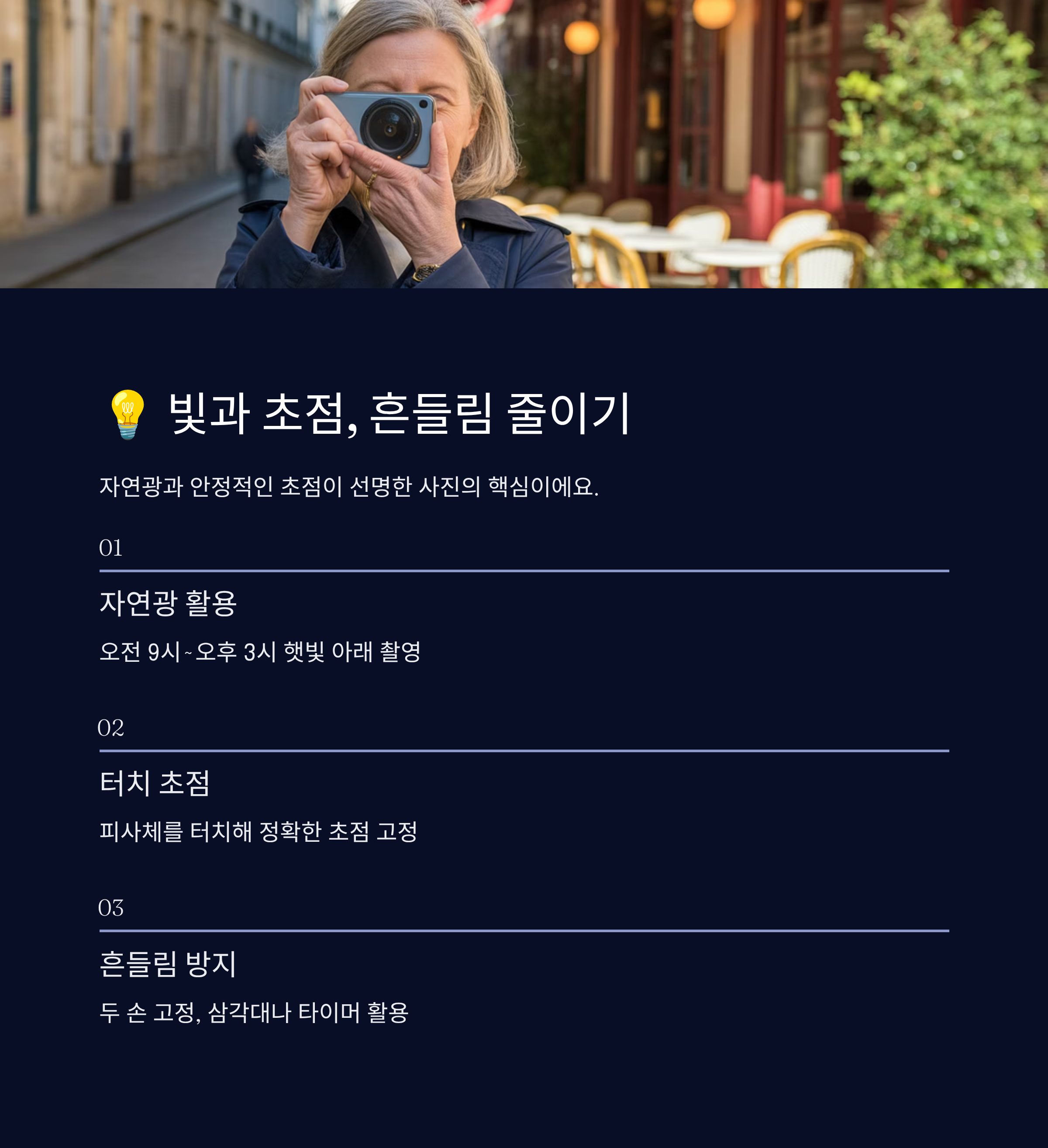 빛과 초점만 잘 잡아도 화질이 한 단계 더 올라간답니다! 꼭 기억해두세요 📷