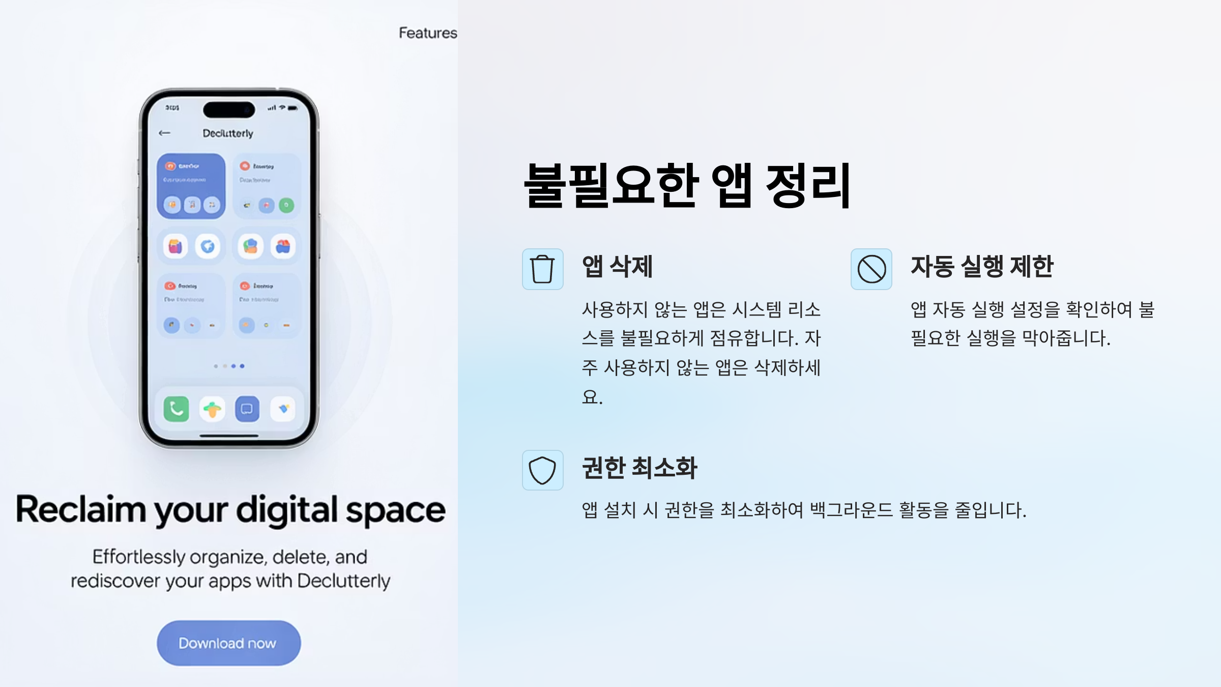 앱 설치 시 권한을 최소화하여 백그라운드 활동을 줄입니다.