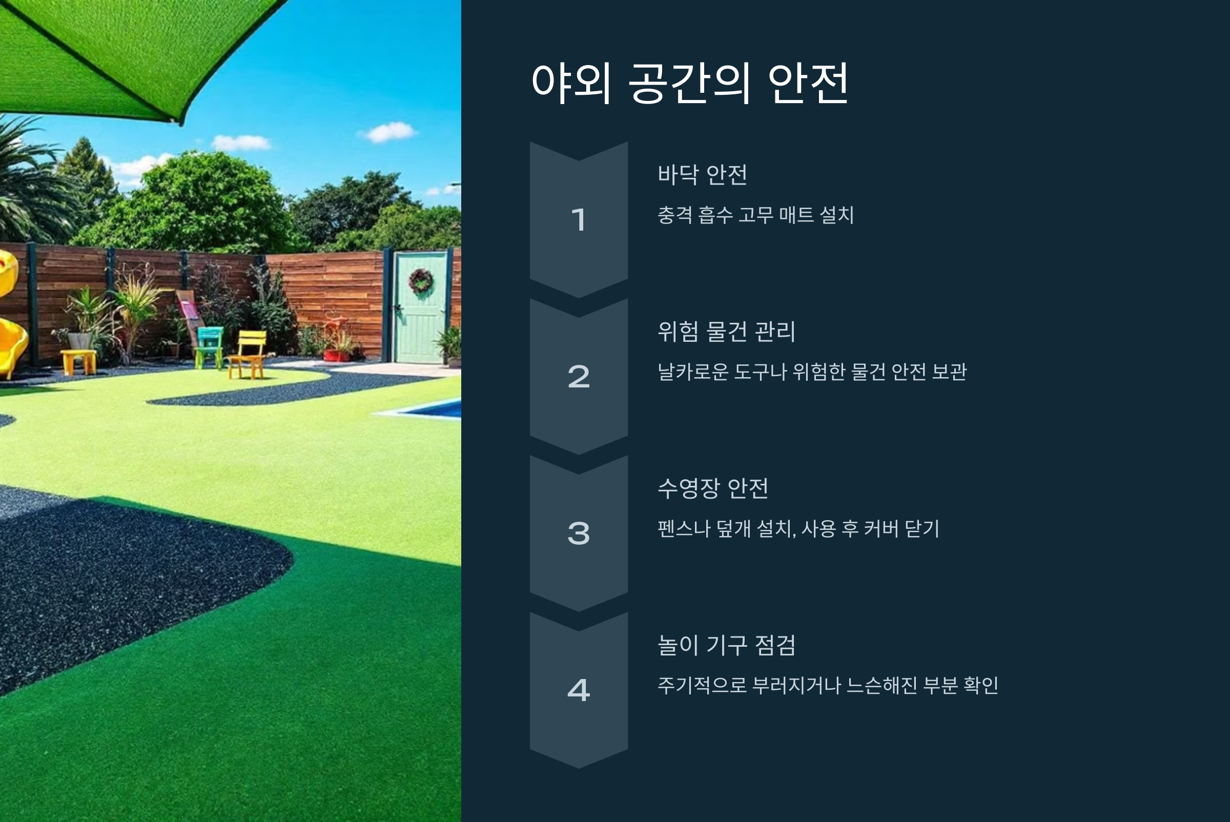 안전한 야외 공간을 제공하는 것은 아이들의 놀이와 모험을 돕는 동시에 위험을 줄이는 중요한 부분이에요.