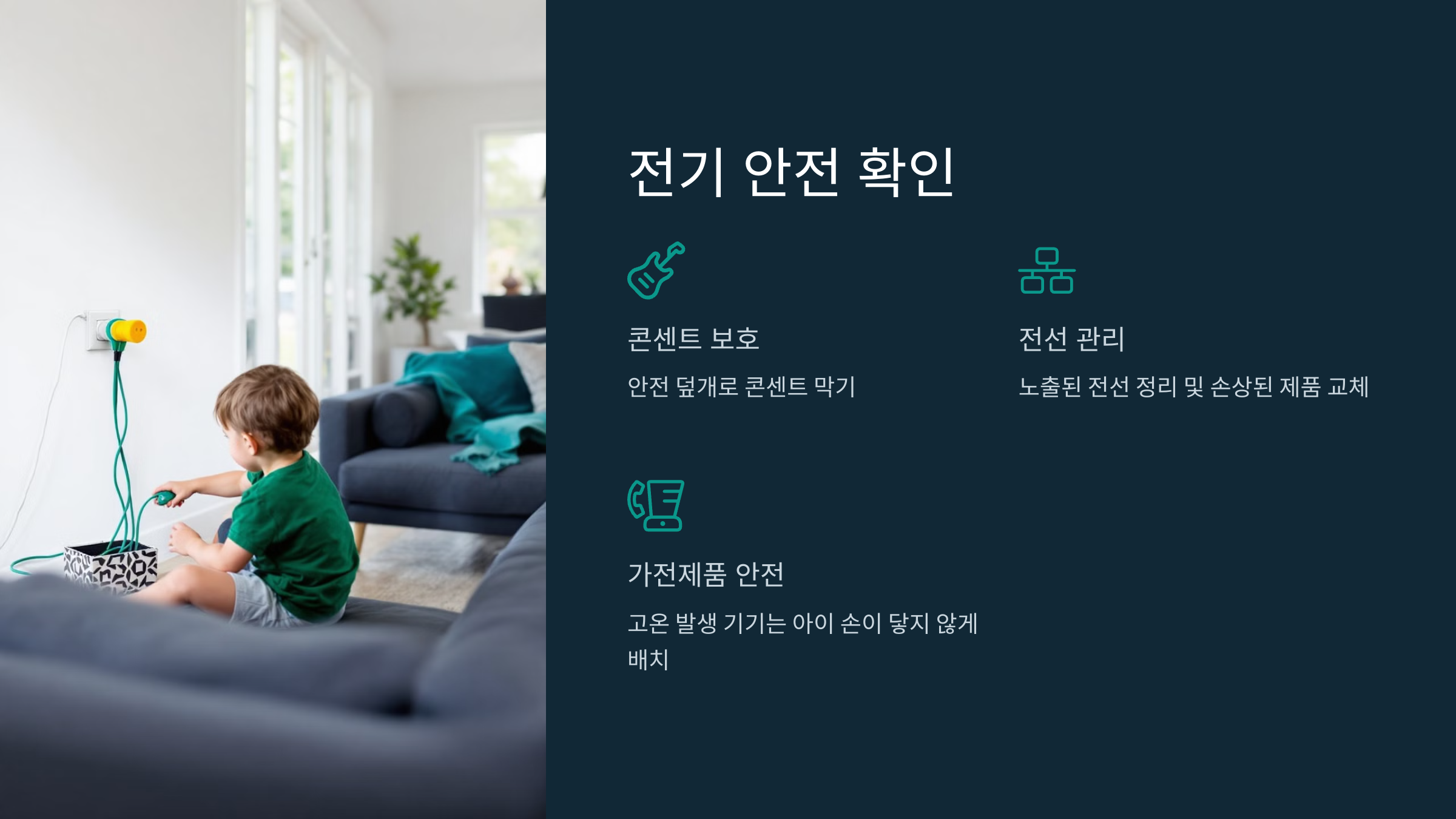 전기는 가정 내에서 가장 흔한 사고 원인 중 하나로, 아이들의 호기심은 이러한 사고를 유발할 가능성을 높여요. 콘센트는 반드시 안전 덮개로 막아 두는 것이 좋아요. 아이들이 손가락이나 금속 물체를 넣지 못하게 하는 간단한 조치지만, 효과는 매우 크답니다.