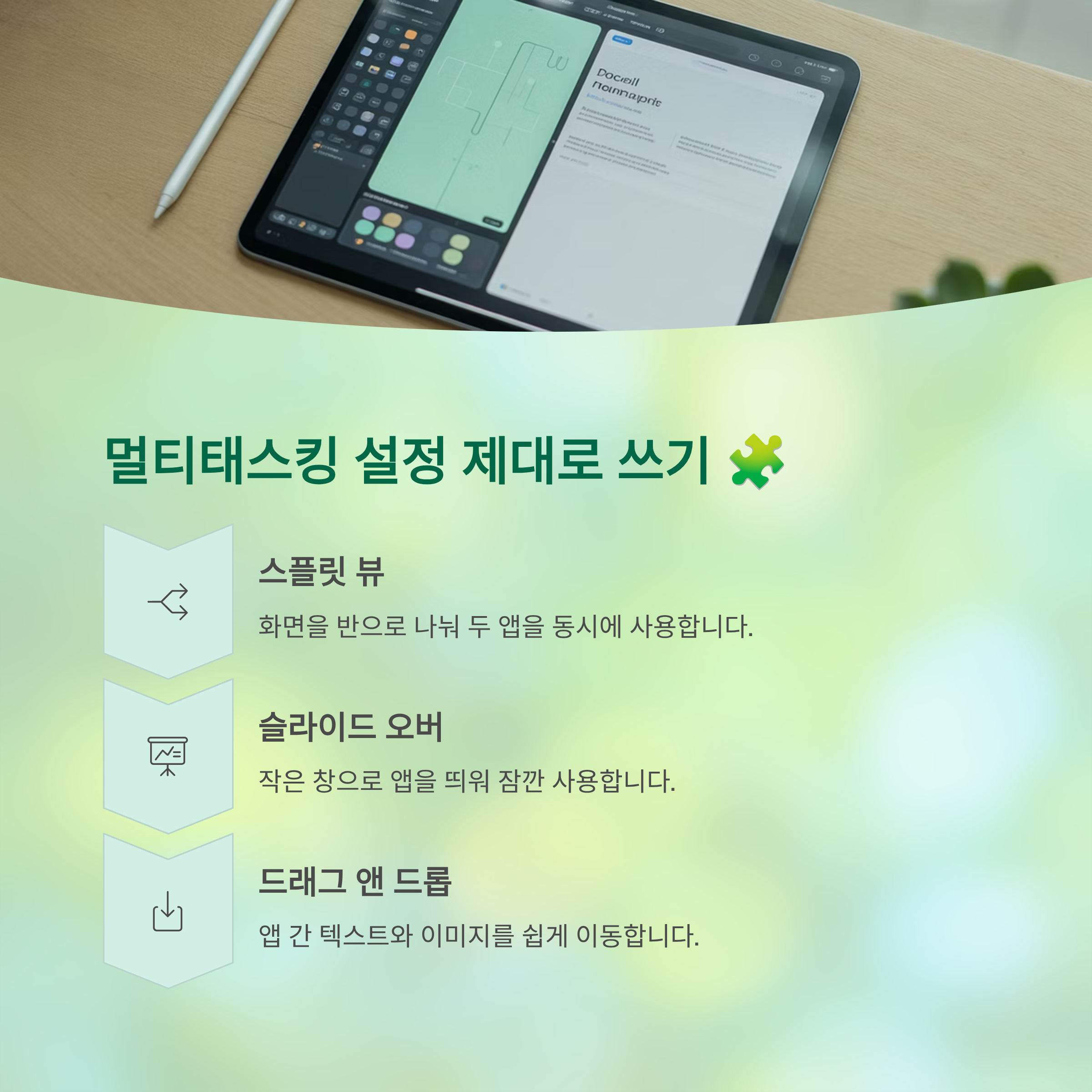이 기능들을 잘 익혀두면 아이패드가 단순한 태블릿이 아니라 진짜 미니 컴퓨터처럼 느껴질 거예요. 멀티태스킹은 처음엔 낯설 수 있지만, 익숙해지면 정말 빠질 수 없어요!