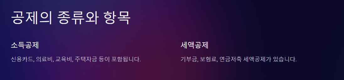 소득공제: 신용카드, 의료비, 교육비, 주택자금 등이 포함됩니다.