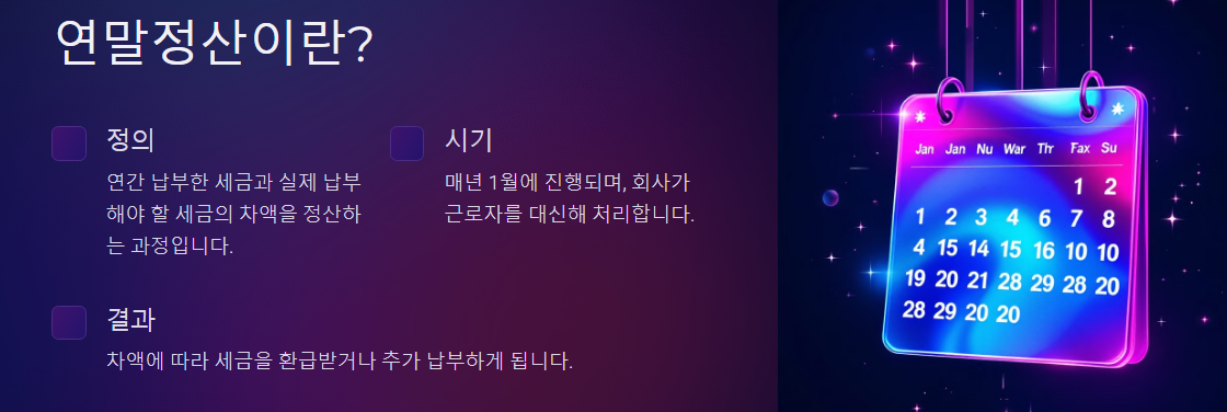 한국에서는 연말정산을 '13월의 월급'이라고 부르기도 합니다.