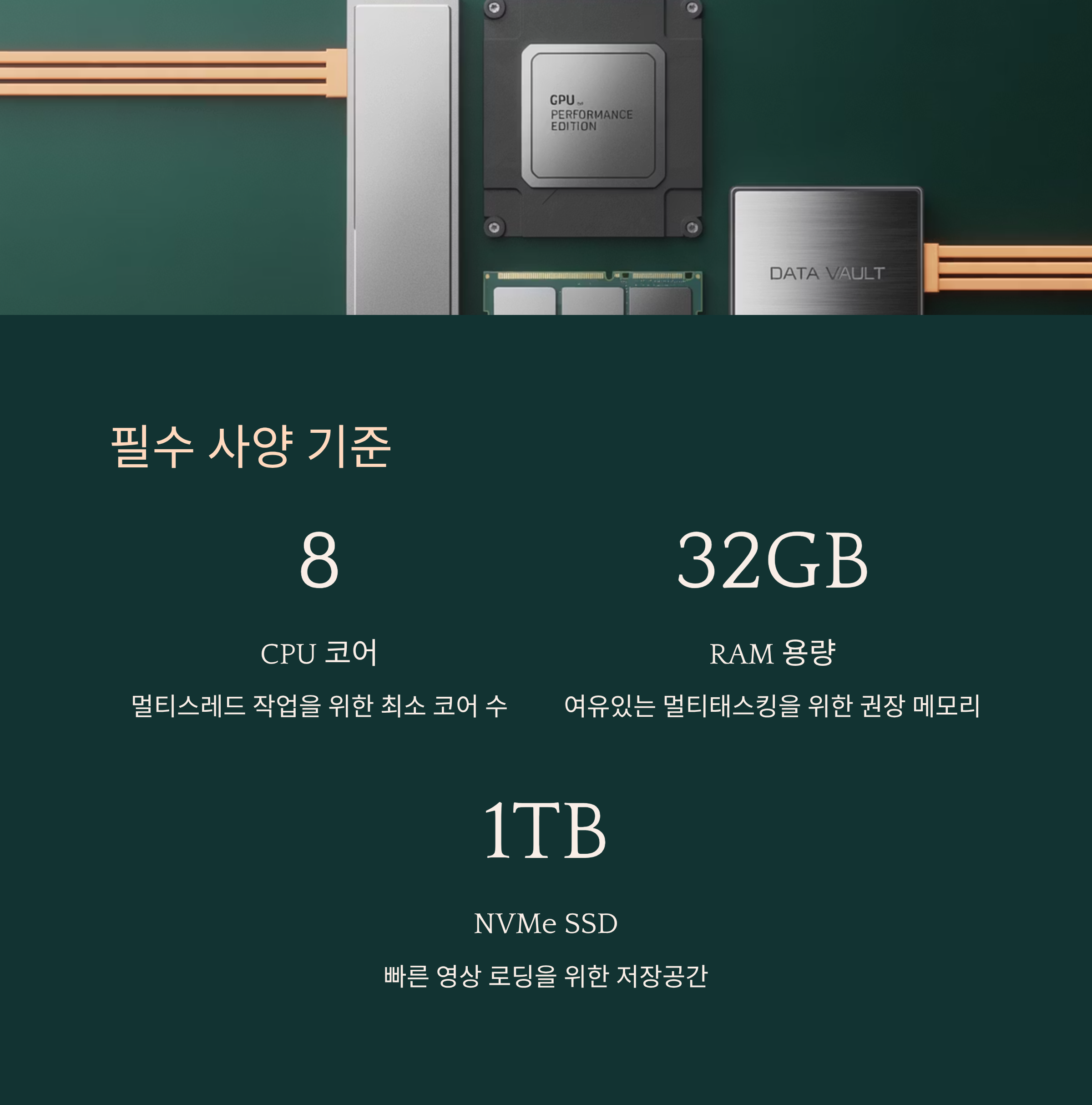 | Adobe Premiere Pro | Intel i7 이상 / Ryzen 7 이상 | RTX 3060 이상 | 32GB 이상 | NVMe SSD 1TB 이상 |