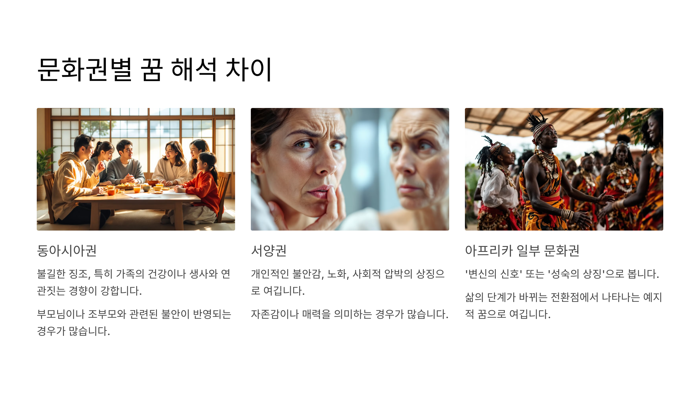 이가 빠지는 꿈에 대한 해석은 나라와 문화에 따라 달라요. 한국과 중국, 일본 등 동아시아권에서는 보통 불길한 징조, 특히 가족의 건강이나 생사와 연관짓는 경향이 강해요. 그래서 부모님이나 조부모와 관련된 불안이 반영되는 경우가 많아요.