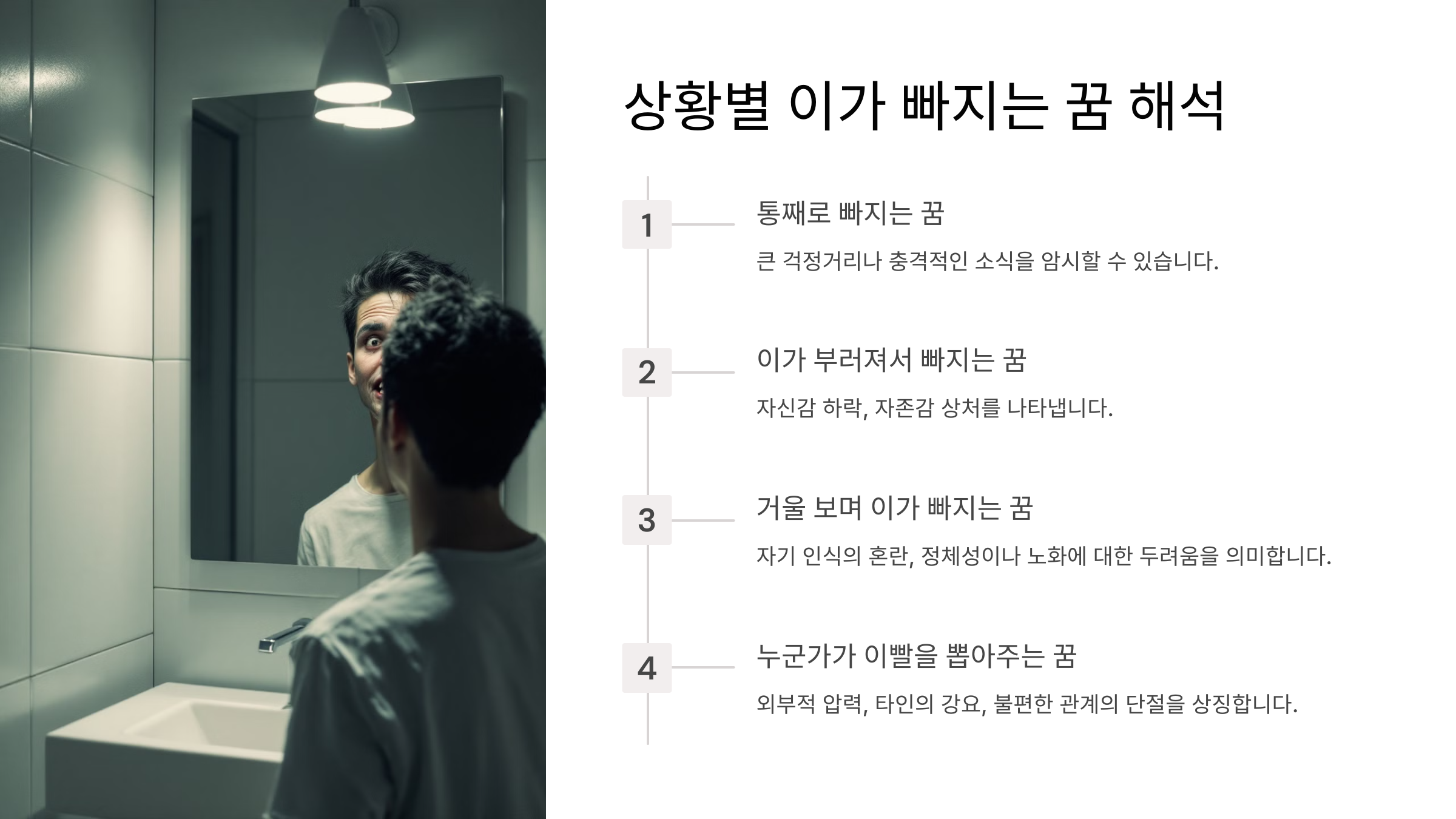 이가 빠지는 꿈에도 다양한 버전이 있어요. 그냥 우두둑 빠지는 꿈, 뽑으려고 했는데 빠지는 꿈, 누가 이빨을 건드리는 꿈 등등이죠. 이런 세부 상황은 각각 다른 의미를 담고 있어요. 아래에서 상황별로 정리해볼게요.