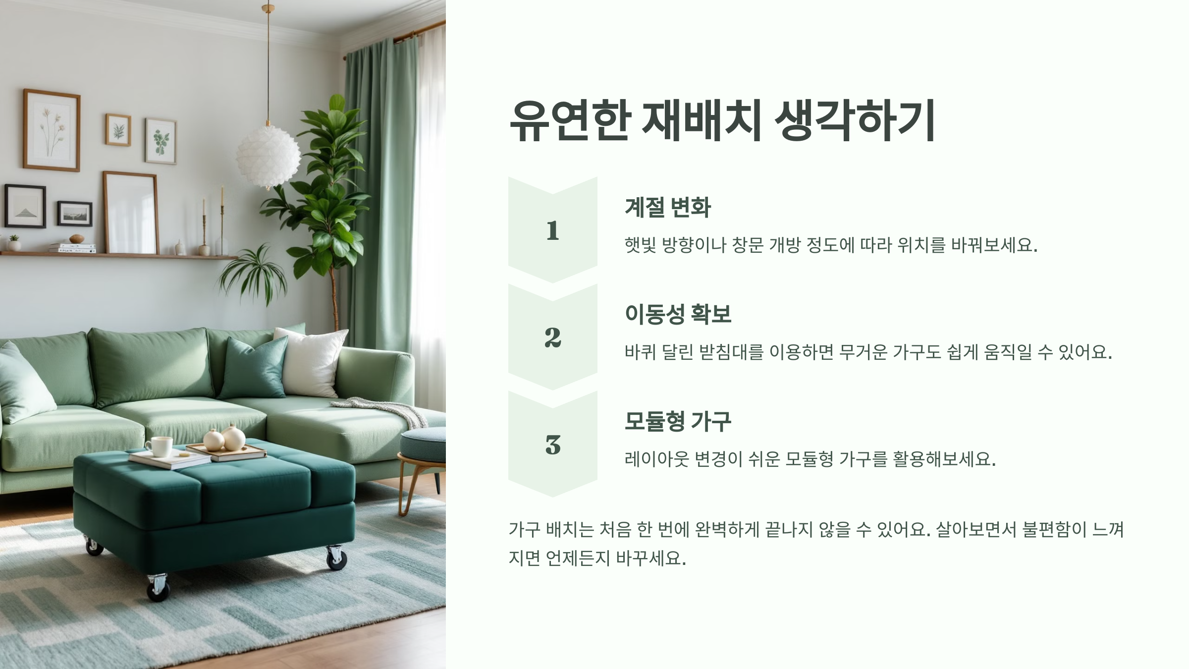 가구 배치는 처음 한 번에 완벽하게 끝나지 않을 수도 있어요. 살아보면서 불편함이 느껴지면 언제든지 바꾸는 게 좋아요. 한 번 정한 배치라고 너무 고집할 필요는 없어요!
