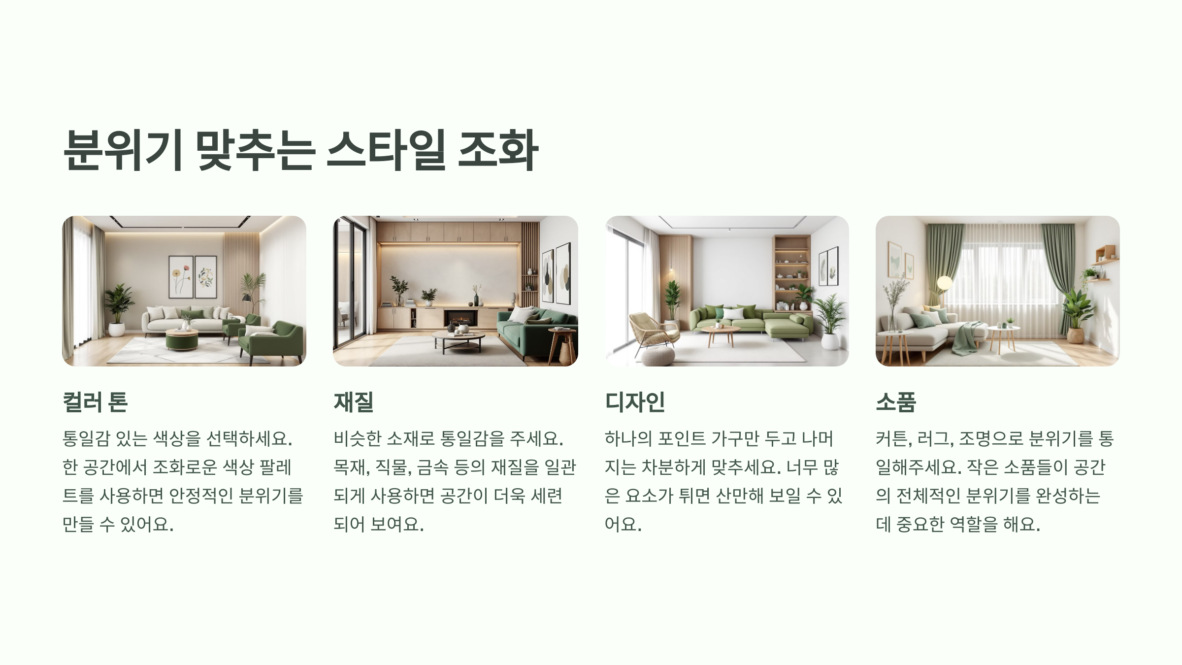 또한 커튼, 러그, 조명 같은 소품으로 분위기를 통일해주는 것도 스타일 밸런스를 맞추는 중요한 포인트예요. 작은 것 같지만 전체 인테리어에 큰 차이를 만들어요.