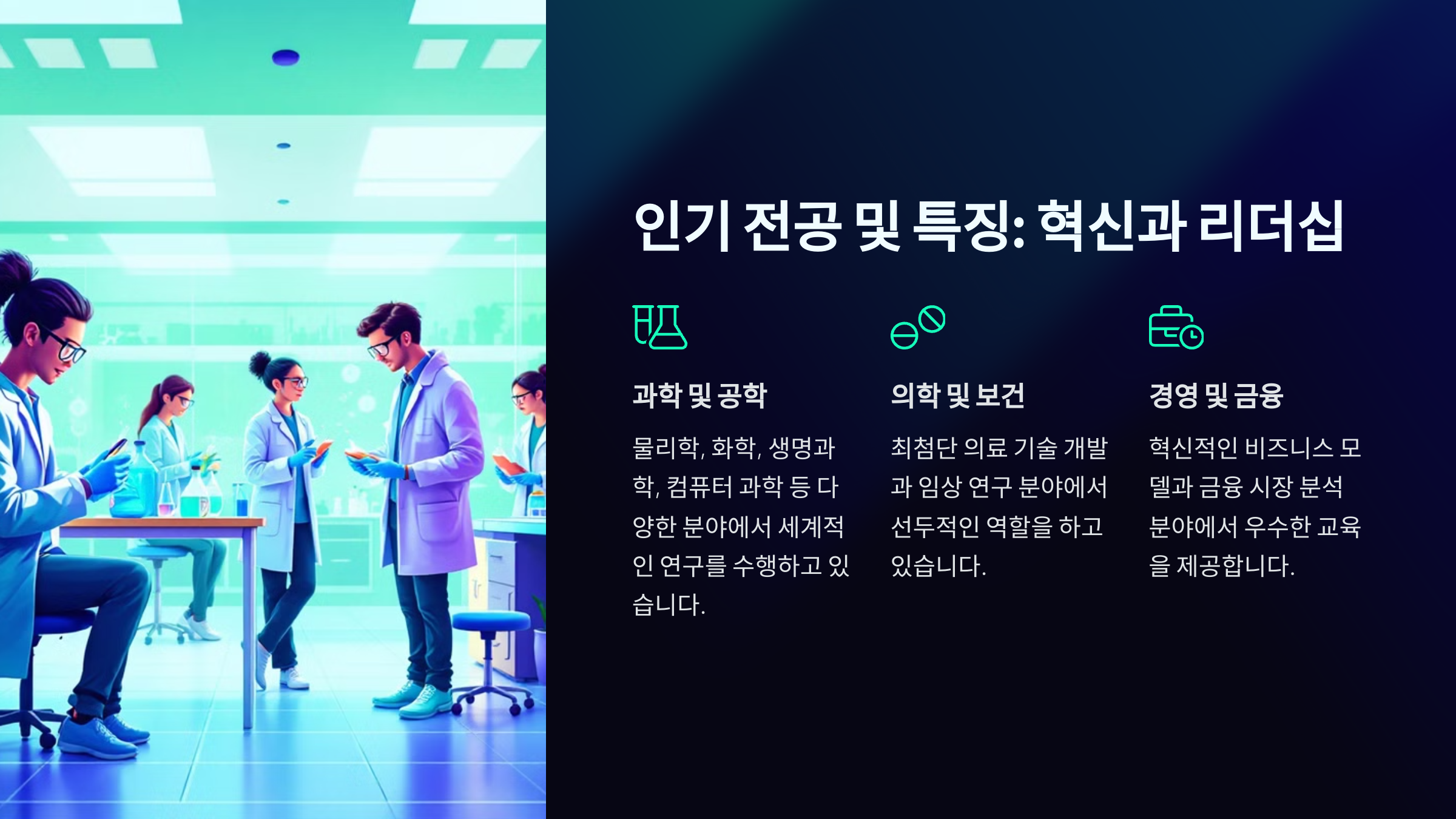 임페리얼 칼리지 런던은 STEM(과학, 기술, 공학, 수학) 분야에서 세계적인 명성을 가지고 있어요. 특히 컴퓨터 과학, 화학공학, 기계공학, 의학, 생명과학 등이 인기 있는 전공이에요. 이 학교의 강점은 학문적 깊이와 실무 응용 능력을 강조하는 커리큘럼에 있어요. 학생들은 최신 기술을 활용한 프로젝트와 연구 기회를 제공받으며, 창의적이고 실질적인 문제 해결 능력을 개발할 수 있어요.