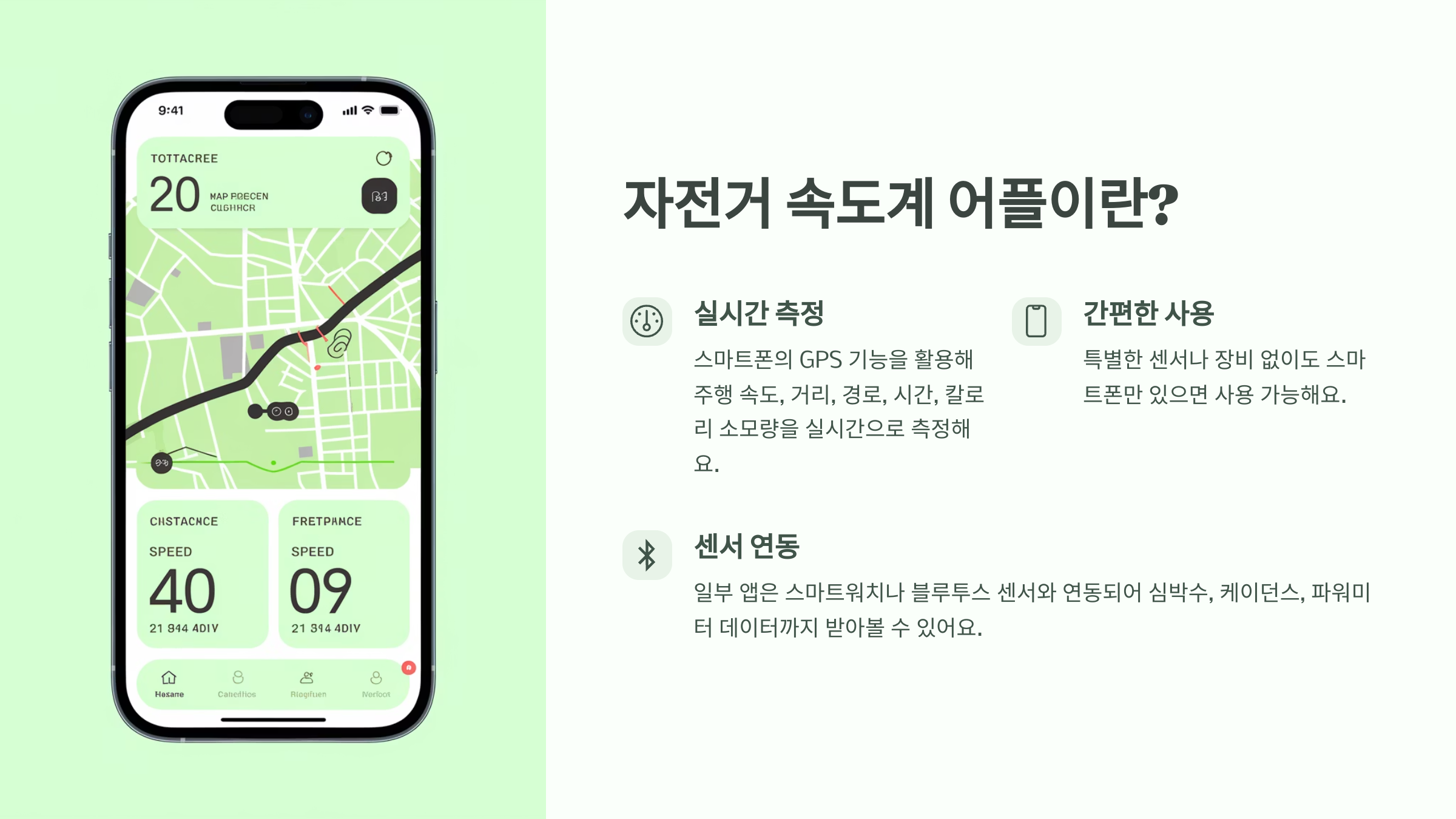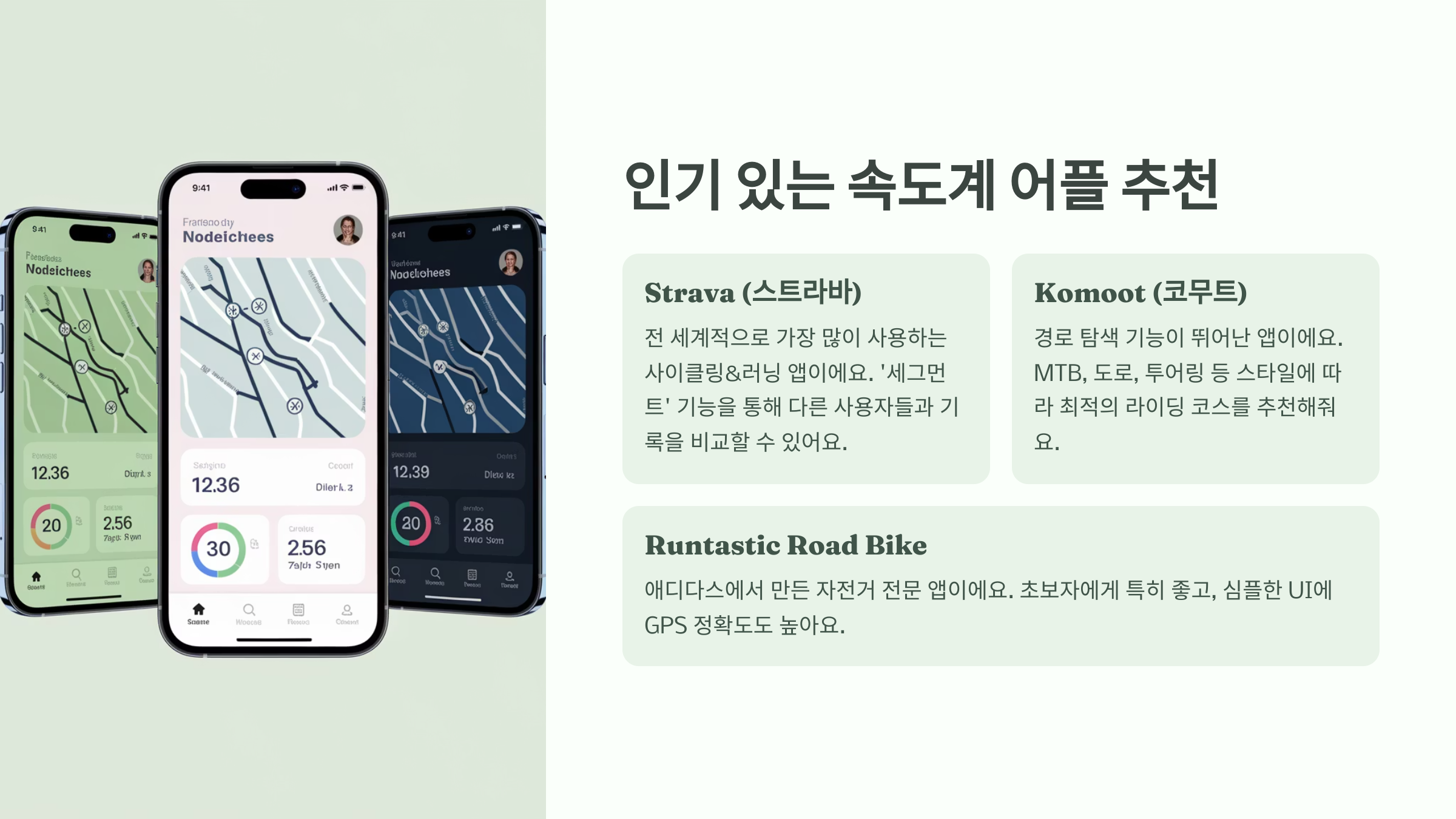 자전거 속도계 어플은 스마트폰의 GPS 기능을 활용해 주행 속도, 거리, 경로, 시간, 칼로리 소모량 등을 실시간으로 측정하고 기록해주는 앱이에요. 즉, 자전거용 컴퓨터 대신 스마트폰을 사용하는 방식이죠!