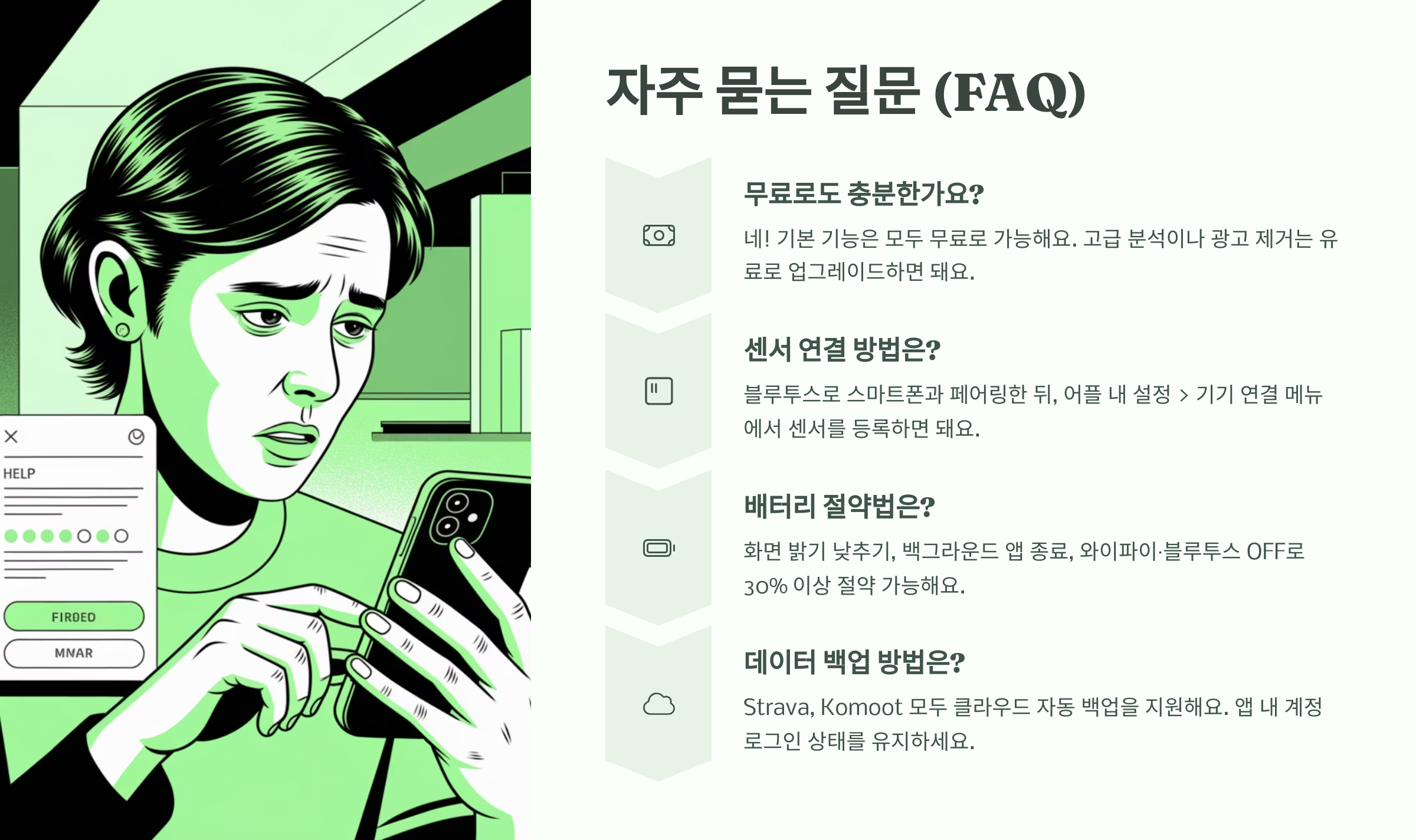 A1. 네! Strava, Komoot, Runtastic 등 기본 기능은 모두 무료로 가능해요. 고급 분석이나 광고 제거는 유료로 업그레이드하면 돼요.