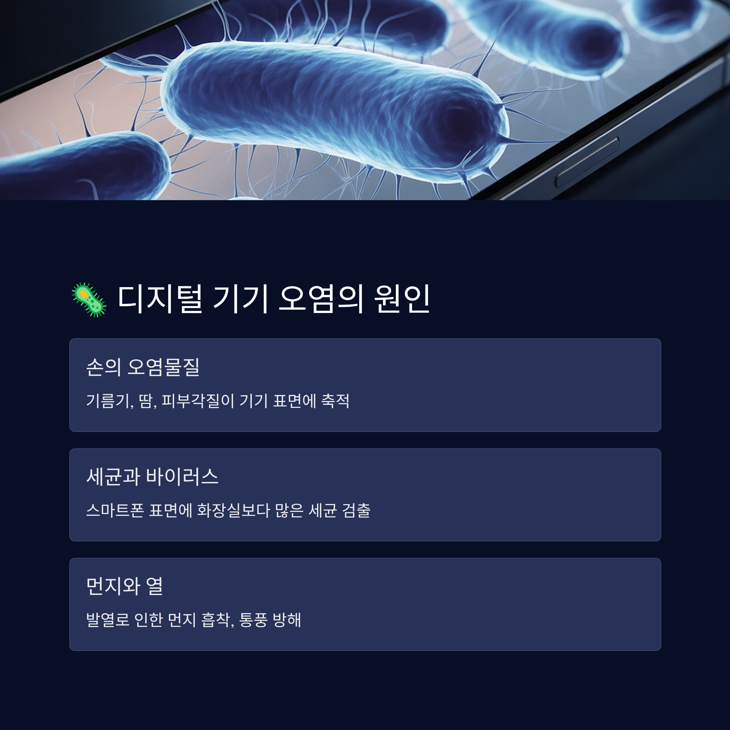 스마트폰, 키보드, 마우스처럼 자주 만지는 디지털 기기들은 손의 기름기, 땀, 먼지, 피부각질, 음식물 찌꺼기 등 다양한 오염물에 쉽게 노출돼요. 특히 손으로 자주 만지는 만큼 세균과 바이러스가 기기 표면에 많이 붙어 있을 수 있죠. 실제로 스마트폰 표면에는 공공 화장실보다 더 많은 세균이 검출되기도 해요. 😱