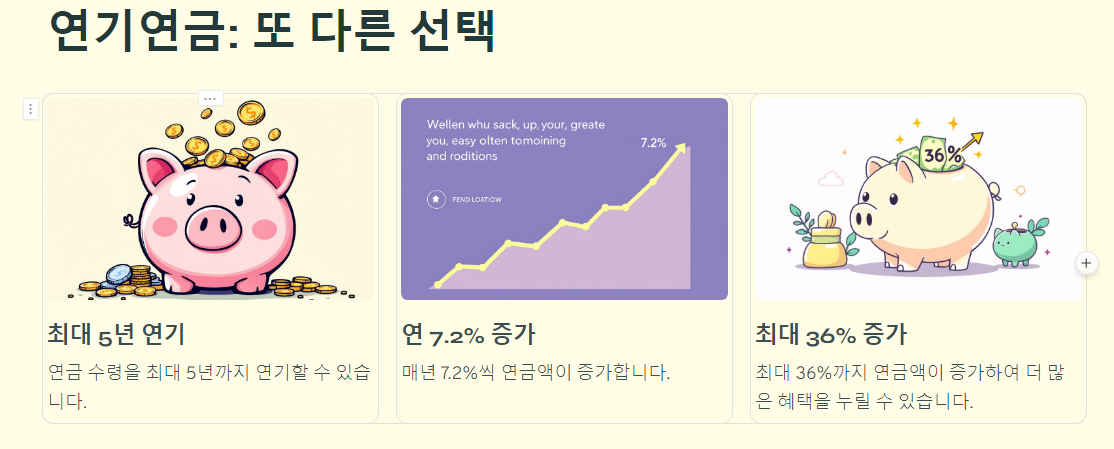 연금액이 1년 연기마다 7.2% 증가하여 5년 연기 시 최대 36%까지 늘어납니다. - 적합 대상:
