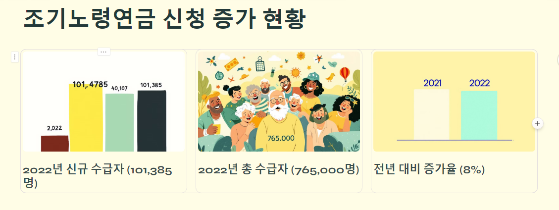 같은 해 조기노령연금 수급자는 총 76만 5천 명으로, 이는 전년 대비 약 8% 증가한 수치입니다.