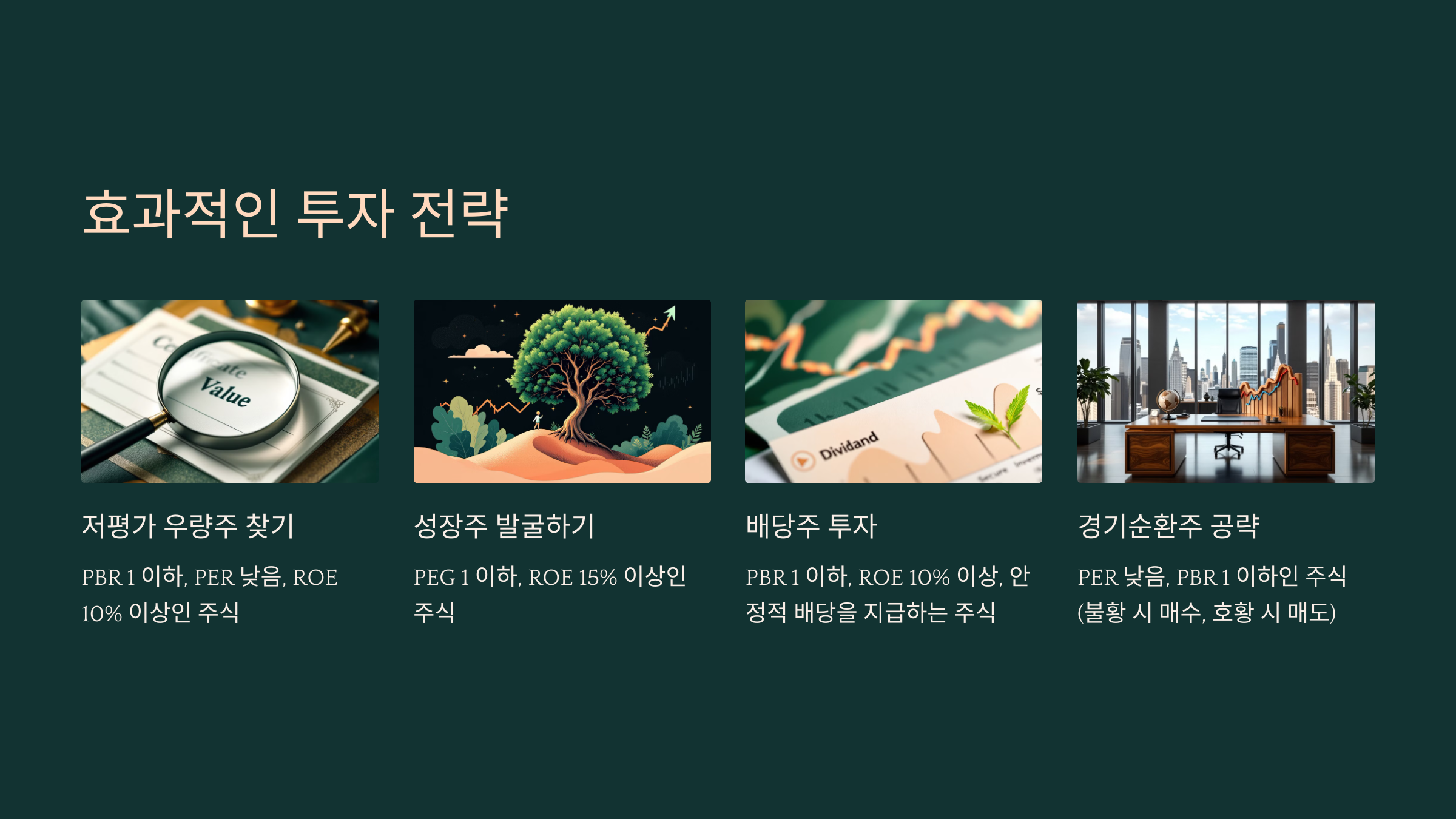 이제 ROE, PER, PBR, PEG 지표를 어떻게 활용하면 좋은지 구체적인 투자 전략을 알아볼게요. 단순히 숫자만 보는 것이 아니라, 기업의 성장성과 시장 환경을 고려하는 것이 중요해요.