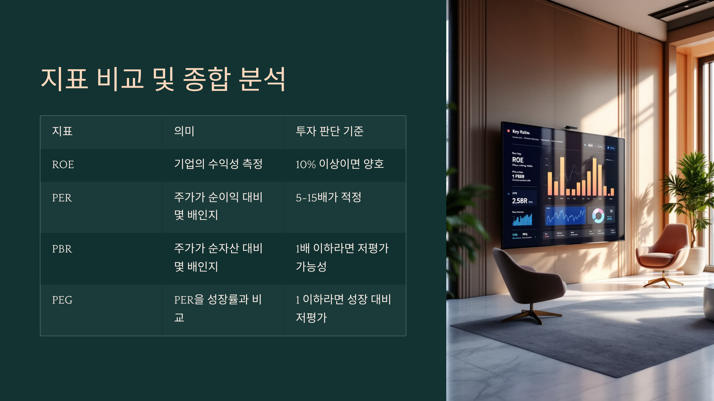 지금까지 ROE, PER, PBR, PEG의 의미와 계산 방법을 알아봤어요. 하지만 이 지표들을 개별적으로 보는 것보다 종합적으로 비교하면 더 정확한 투자 판단을 할 수 있어요.