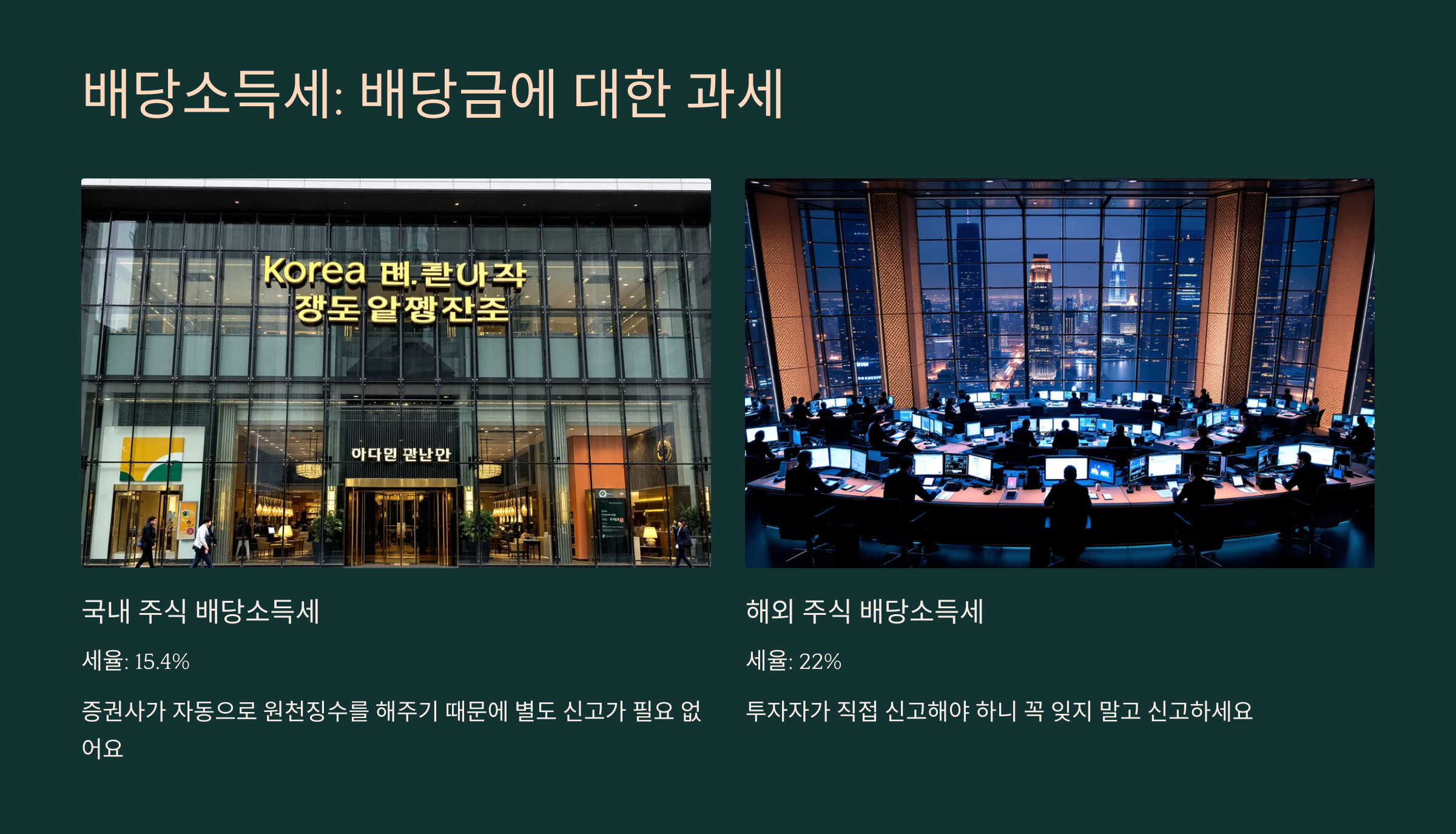 배당금을 받을 경우도 **배당소득세**를 납부해야 하는데, 국내 주식 배당금은 자동으로 원천징수되지만, 해외 주식 배당금은 본인이 직접 신고해야 하는 경우가 많아요.
