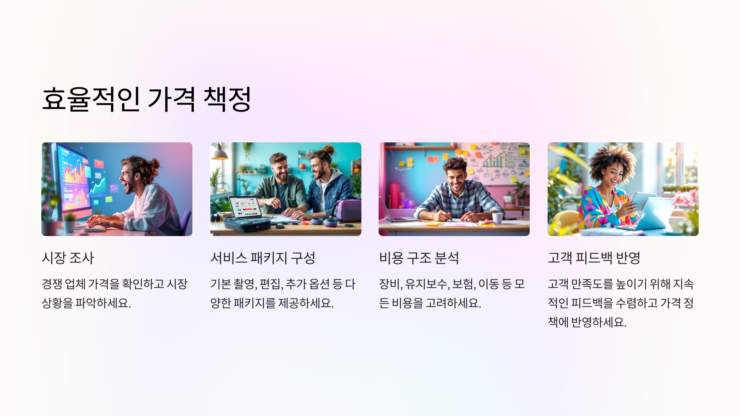 서비스 유형에 따라 패키지를 구성하는 것도 좋은 전략이에요. 예를 들어, 기본 촬영 서비스와 추가 편집 서비스, 드론 촬영 + 정지 사진 서비스 등을 묶어 고객이 선택할 수 있는 옵션을 제공하면 수익성을 높일 수 있어요.