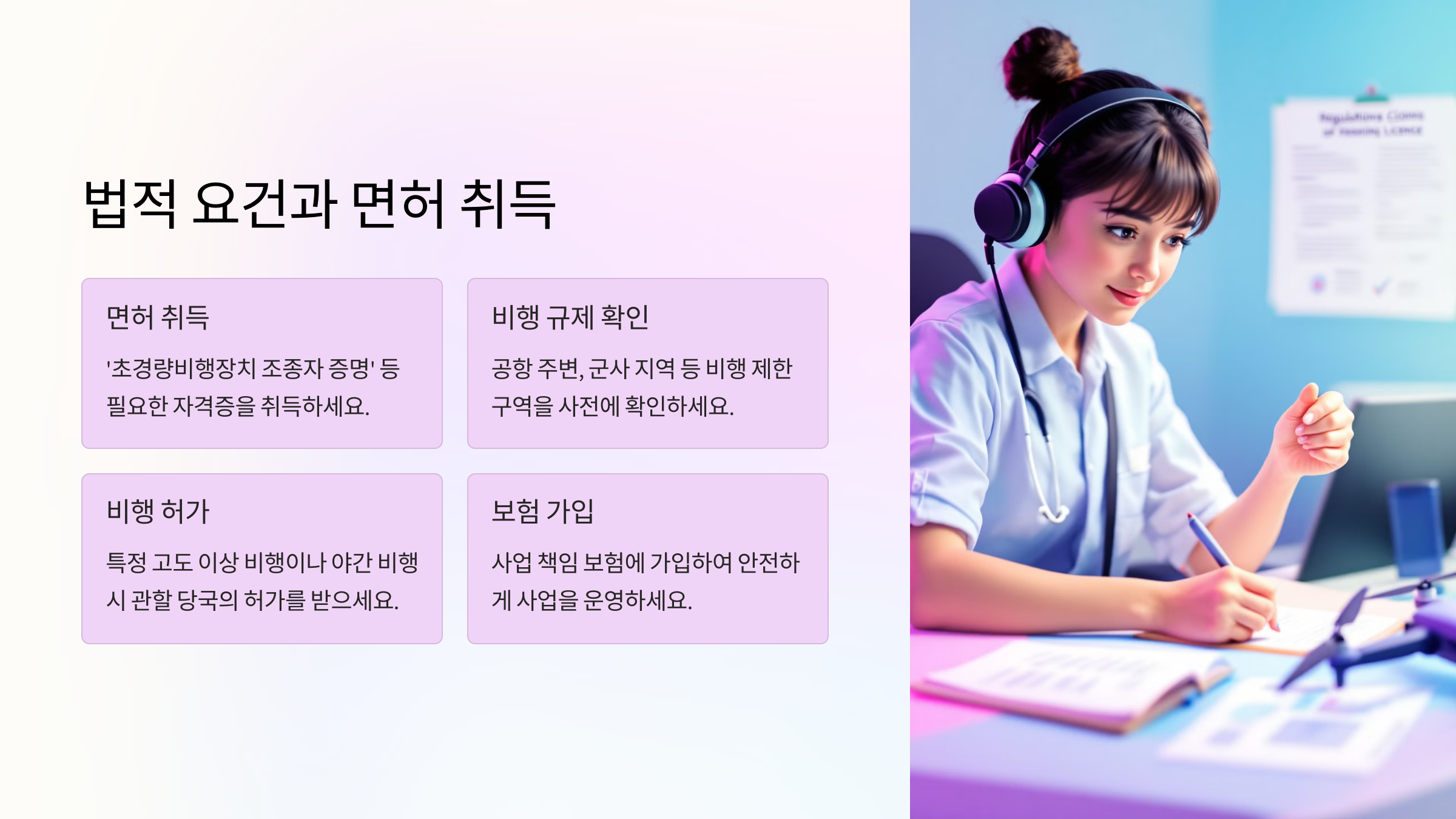 드론 촬영 사업을 시작하려면 반드시 법적 요건을 충족해야 해요. 대부분의 나라에서는 상업용 드론을 운영하기 위해 특별 면허나 자격증을 요구해요. 예를 들어, 한국에서는 '초경량비행장치 조종자 증명'을 취득해야 하며, 이를 위해 필기시험과 실기시험을 통과해야 한답니다.