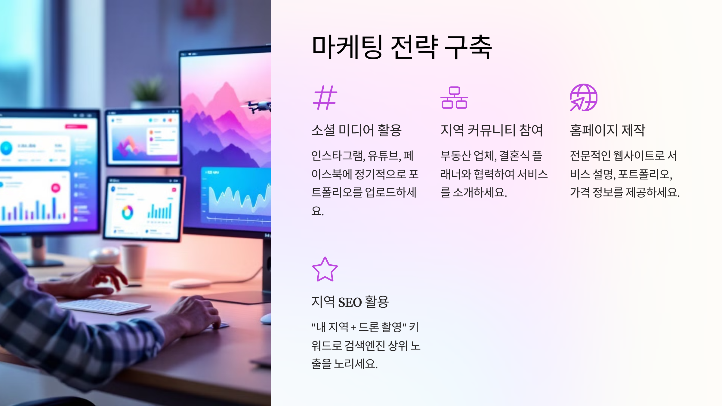 마지막으로, 지역 SEO(Search Engine Optimization)를 활용하세요. "내 지역 + 드론 촬영" 키워드를 타겟으로 설정해 검색엔진에서 상위에 노출되면 더 많은 고객이 연락할 가능성이 높아져요.