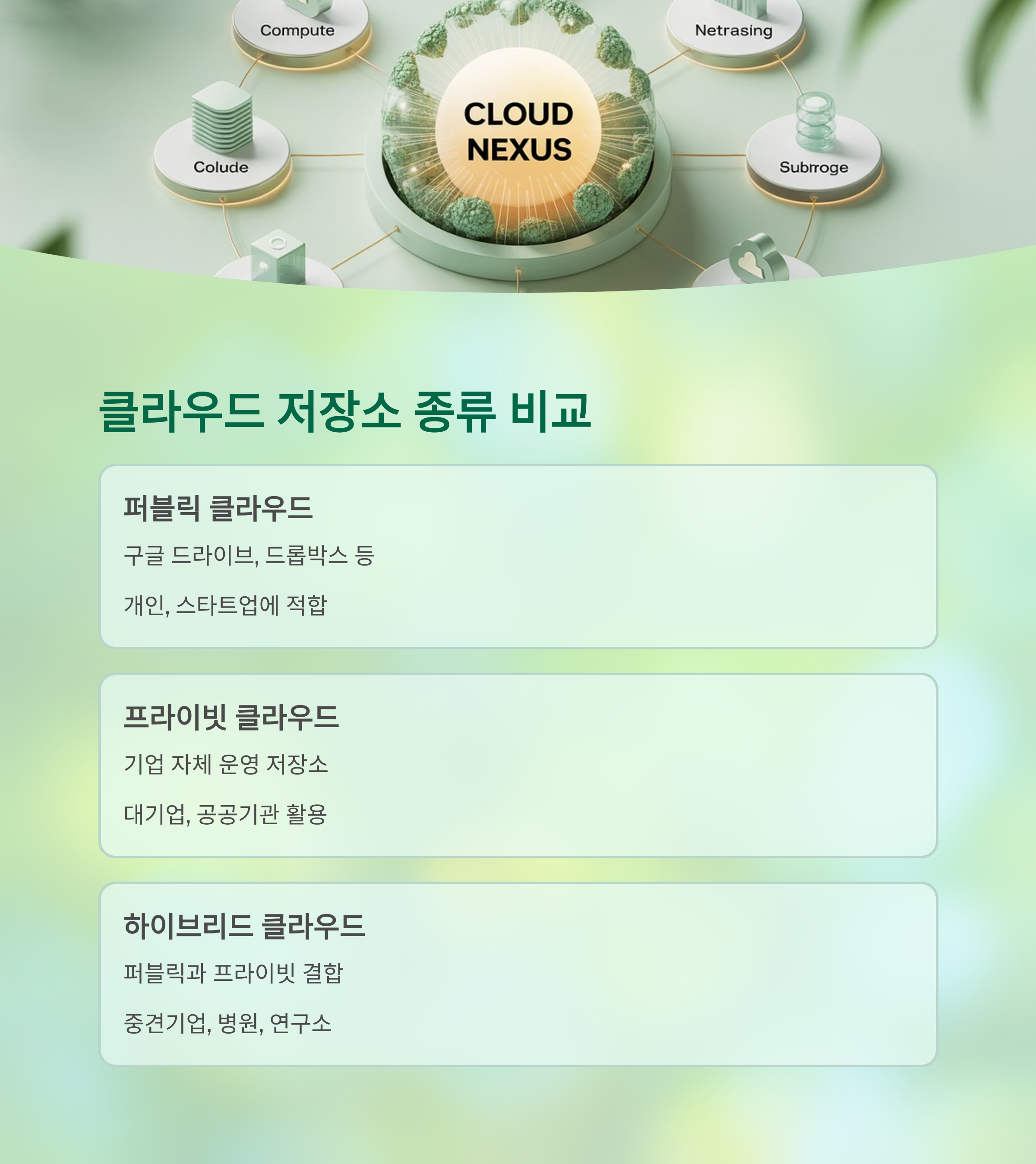 클라우드 저장소는 목적과 대상에 따라 다양한 형태로 나뉘어요. 크게 퍼블릭 클라우드, 프라이빗 클라우드, 하이브리드 클라우드의 세 가지로 구분할 수 있는데요, 각각의 특징을 이해하면 상황에 맞는 선택이 쉬워져요.