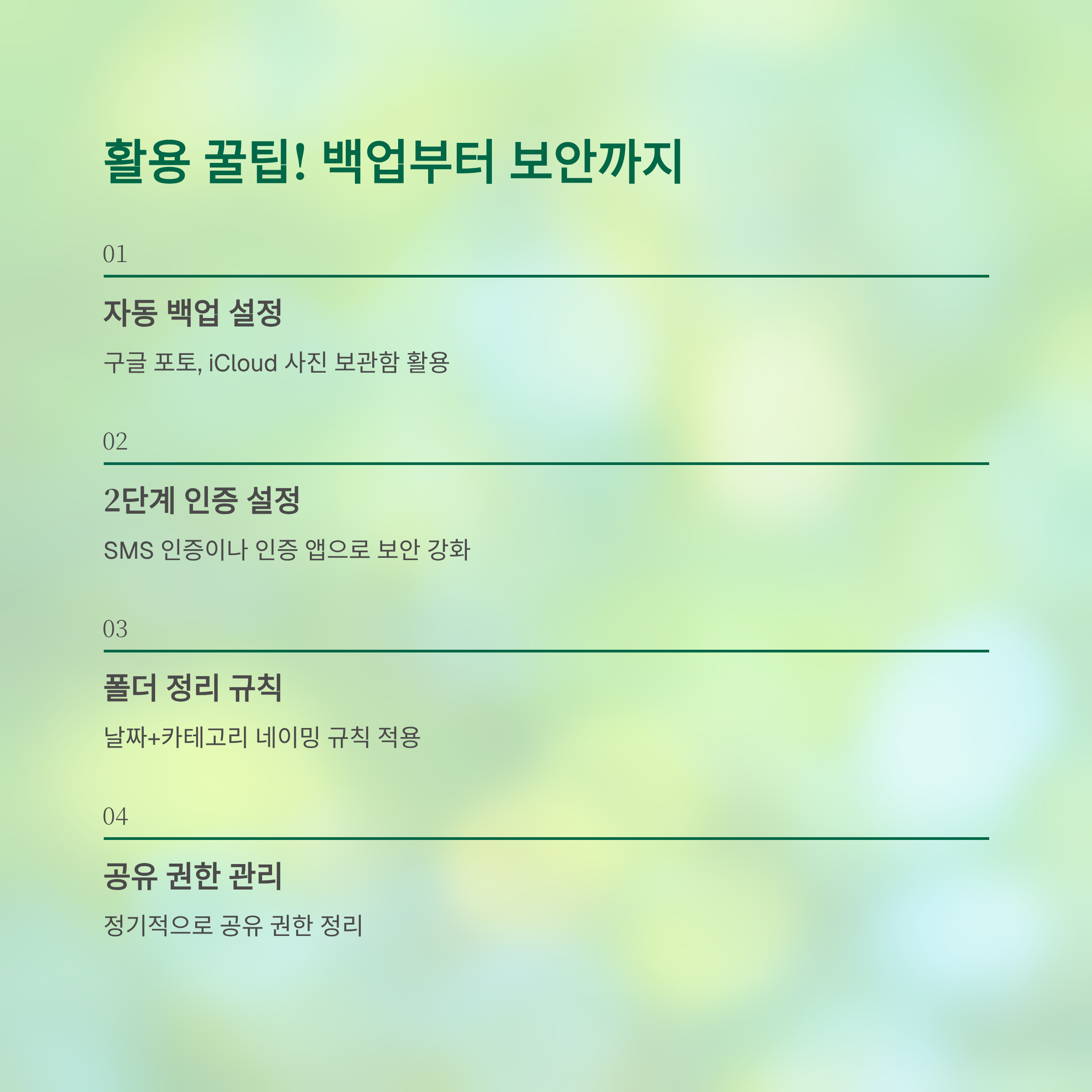 | 자동 백업 | 기기 내 데이터를 클라우드로 자동 전송 | 구글 포토, 아이클라우드 설정 활용 |