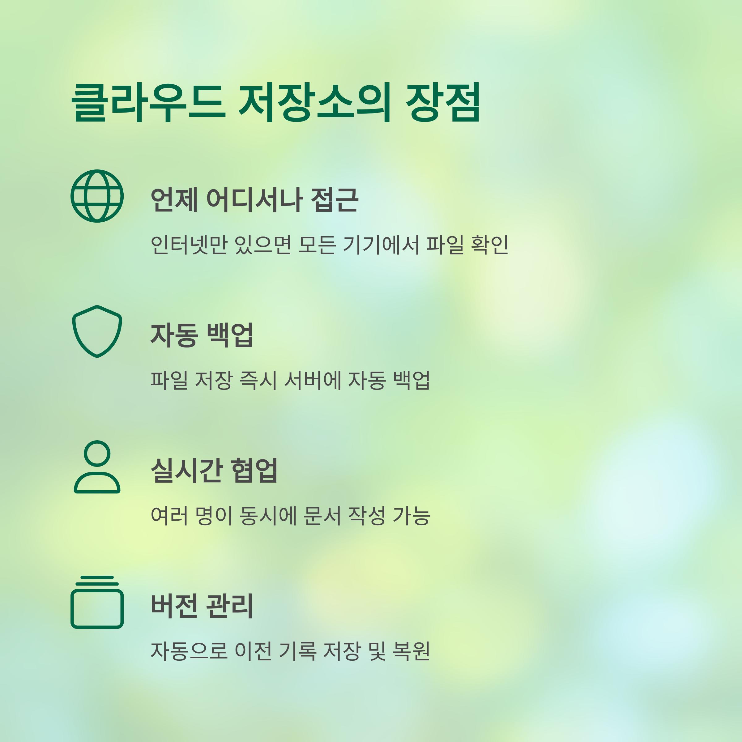 이런 활용 방법을 습관처럼 실천하면 클라우드 저장소가 정말 유용해져요. 자료를 잃어버릴 걱정도 줄고, 업무도 훨씬 깔끔해져요. ✨ 작은 습관이 큰 차이를 만들어내요!