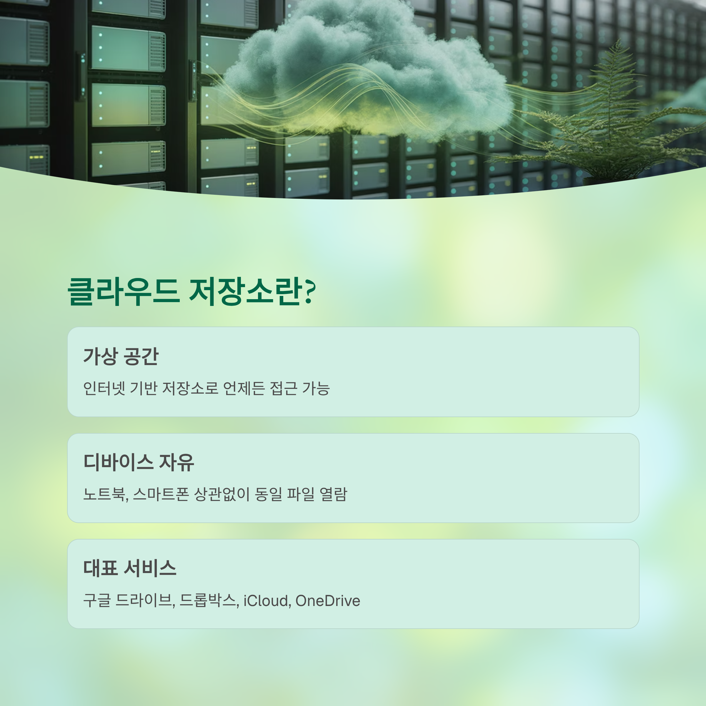 클라우드 저장소는 인터넷 기반의 가상 공간이에요. 사용자가 직접 하드디스크나 USB에 데이터를 저장하지 않고, 인터넷만 있으면 언제 어디서든 접속할 수 있는 저장 공간이죠. 이런 시스템 덕분에 노트북이든 스마트폰이든 디바이스에 상관없이 동일한 파일을 열 수 있어요.