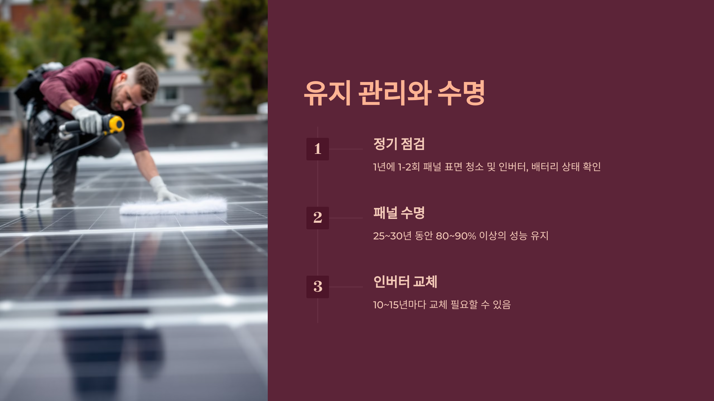 1년에 한두 번 정도 패널 표면을 청소하고, 인버터와 배터리의 작동 상태를 확인하는 것이 좋아요. 전문가의 점검 서비스를 이용하면 더 정확하고 안전하게 관리할 수 있어요.