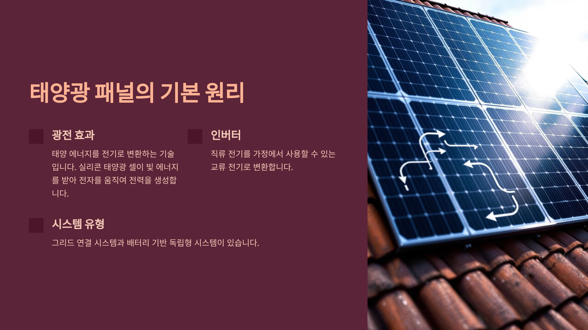 태양광 패널은 태양 에너지를 전기로 변환하는 기술이에요. 주로 실리콘을 이용한 태양광 셀로 구성되어 있으며, 빛 에너지를 받아 전자를 움직이게 만들어 전력을 생성하죠. 이러한 과정을 광전 효과라고 불러요. 태양광 시스템은 인버터를 통해 이 직류 전기를 가정에서 사용할 수 있는 교류 전기로 변환합니다.