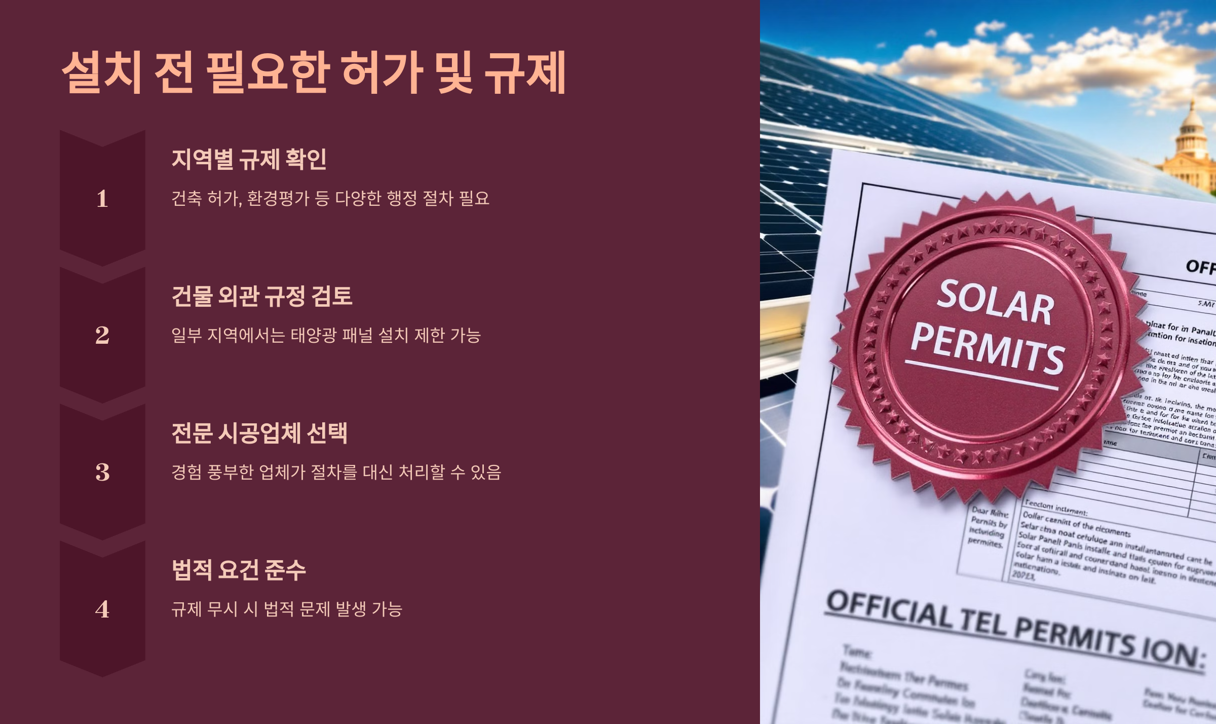 일부 지역에서는 건물 외관을 유지하기 위한 규정이나, 역사적 유산 보호 구역에서는 태양광 패널 설치가 제한될 수도 있어요. 따라서 설치하려는 지역의 규정을 미리 조사하는 것이 중요합니다.