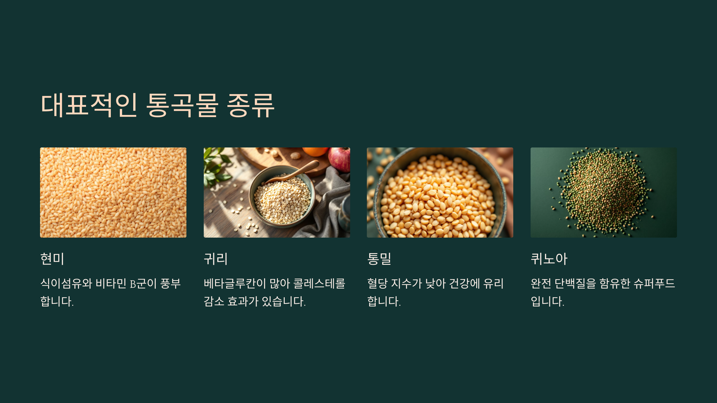 🌾 통곡물은 종류가 다양하며, 각 곡물마다 고유한 영양소와 건강 효능을 가지고 있어요. 식이섬유가 풍부한 곡물부터 단백질이 높은 곡물까지, 다양한 통곡물을 식단에 포함하면 더욱 균형 잡힌 영양 섭취가 가능해요.
