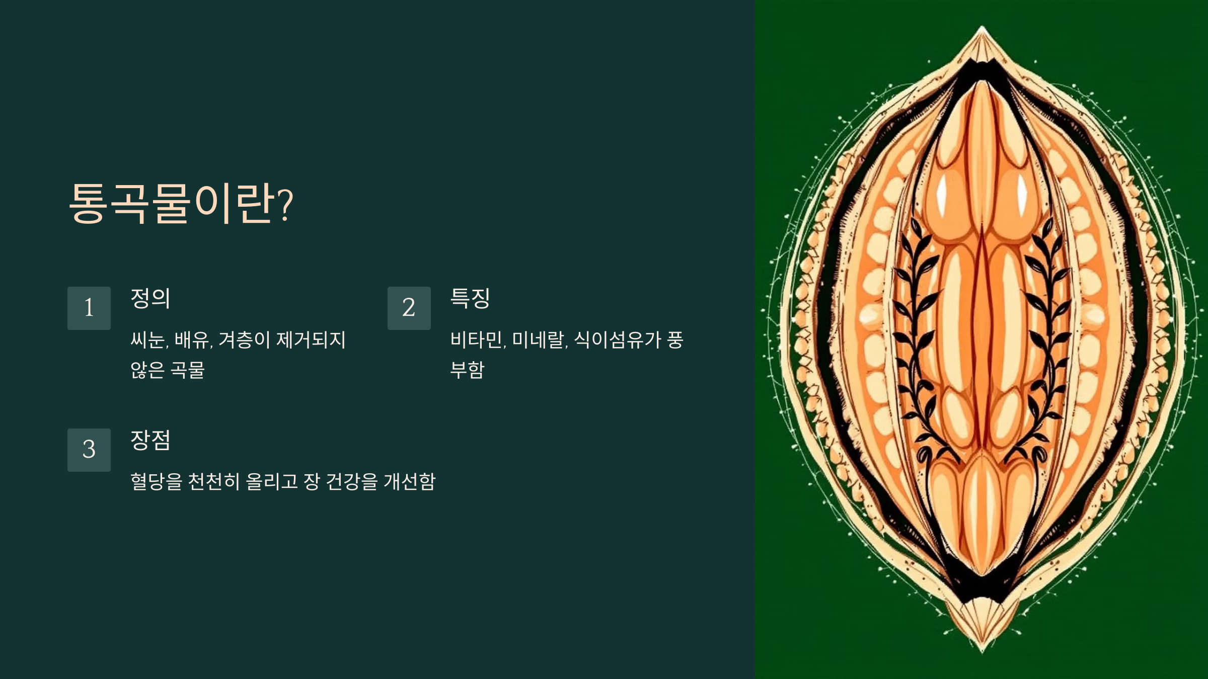 🌾 통곡물은 씨눈(배아), 배유, 겨층이 온전하게 남아 있는 곡물을 말해요. 정제 곡물과 달리 가공 과정에서 영양소가 손실되지 않아 비타민, 미네랄, 식이섬유가 풍부해요.