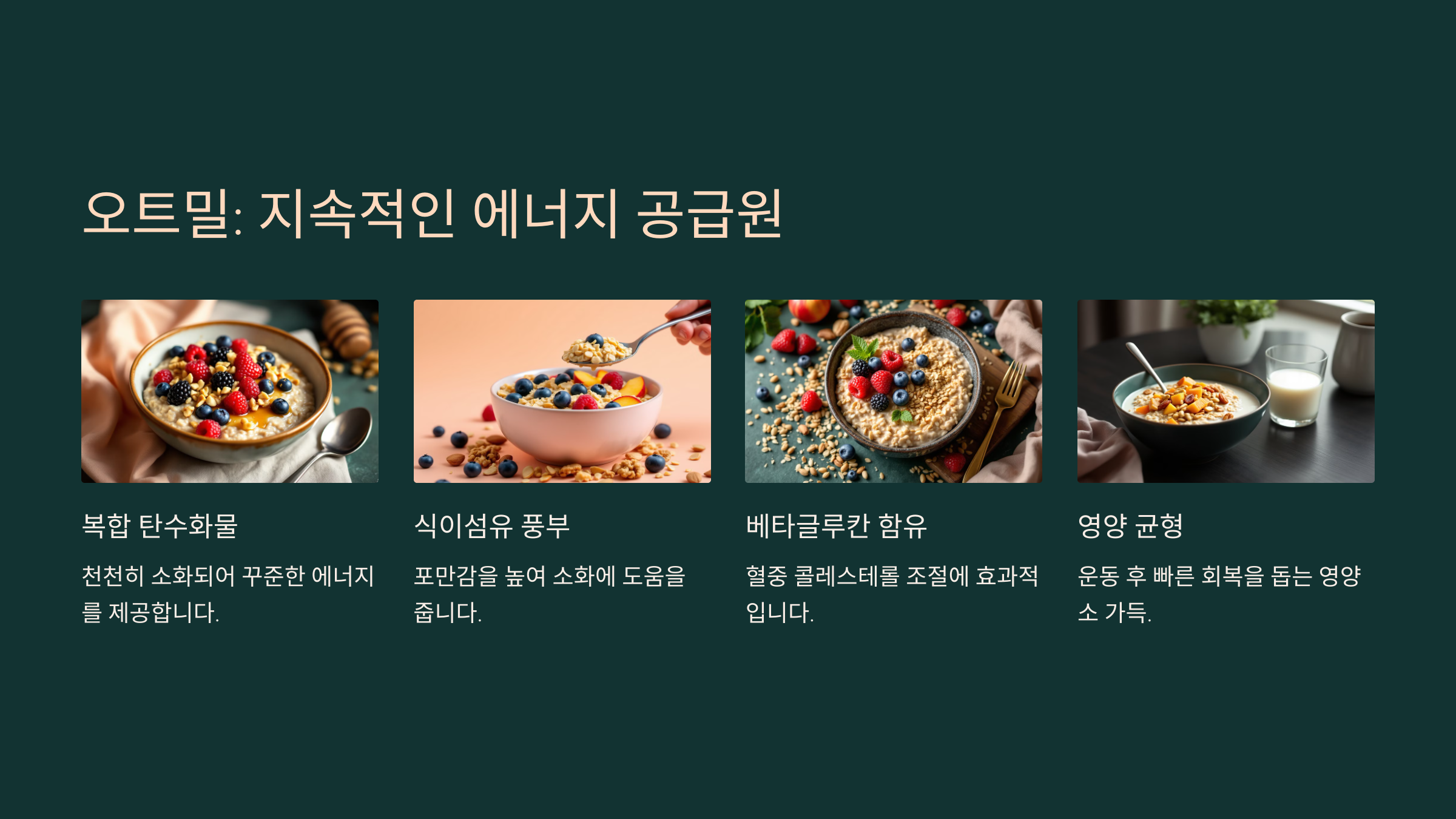 특히 오트밀에 들어 있는 베타글루칸은 콜레스테롤 수치를 낮추고 혈당을 안정적으로 유지하는 데 도움을 줘요.
