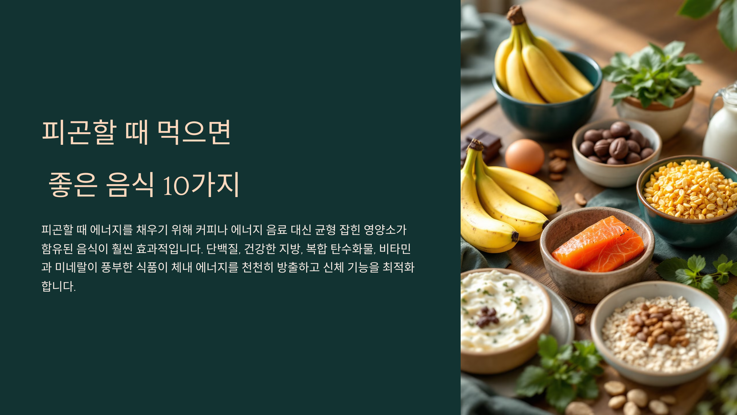 피곤할 때 먹으면 좋은 음식은 주로 단백질, 건강한 지방, 복합 탄수화물, 비타민과 미네랄이 풍부한 식품이에요. 이런 영양소들은 체내 에너지를 천천히 방출하도록 도와주고, 신체 기능을 최적화하는 데 중요한 역할을 해요.