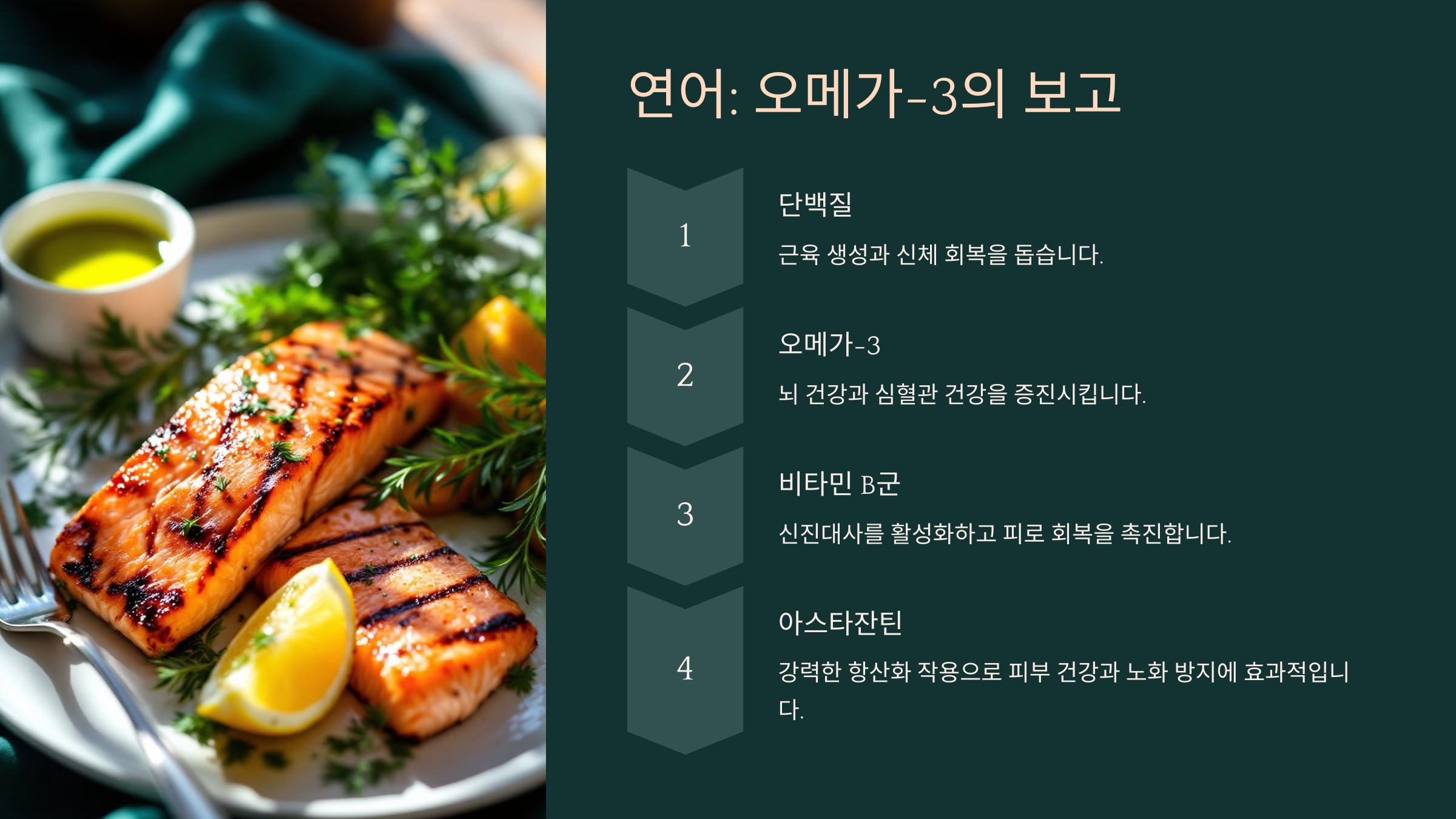 연어는 단백질과 오메가-3 지방산이 풍부해서 에너지를 지속적으로 공급해 주는 건강식품이에요.