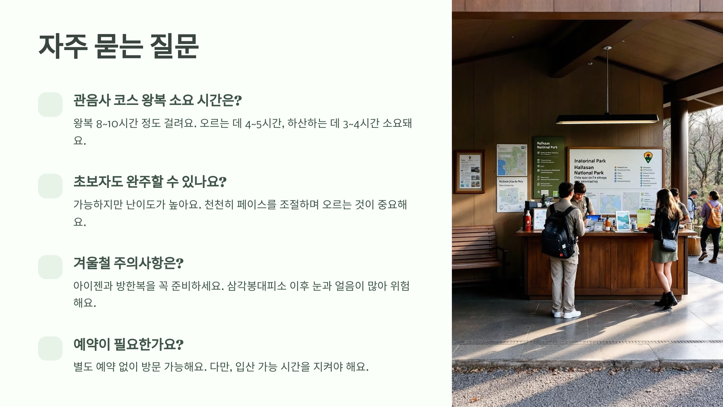 관음사 코스는 하산 시 성판악 코스를 이용하는 경우가 많기 때문에, 미리 대중교통이나 차량 회수 방법을 계획하는 것이 중요해요. 정상에서 휴식을 너무 오래 하면 체온이 떨어질 수 있으므로 방풍 재킷도 필수예요.