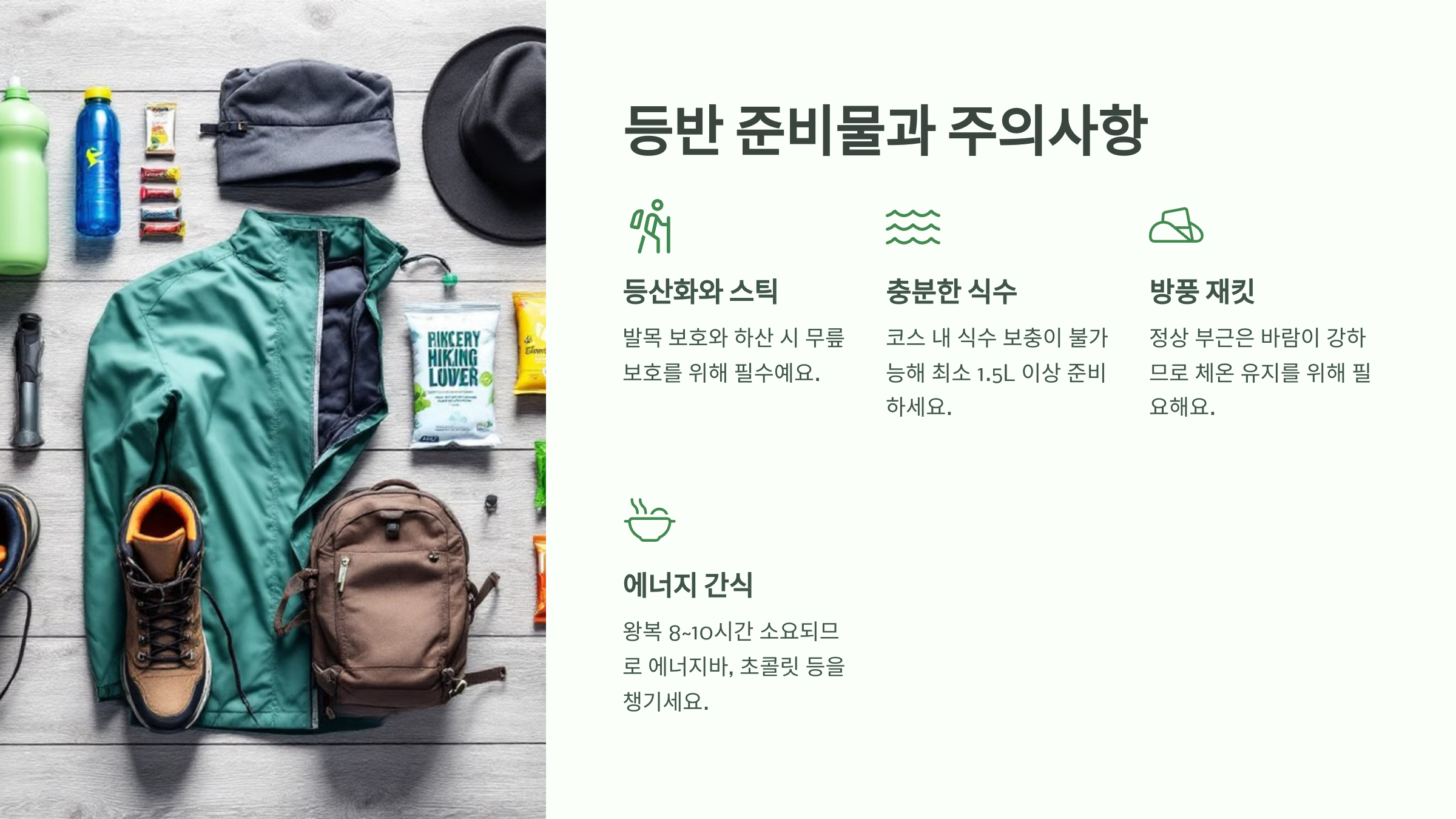 관음사 코스는 준비만 잘하면 더욱 즐겁게 오를 수 있는 곳이에요! 안전한 등반을 위해 필수 준비물을 꼭 챙기세요. 😊