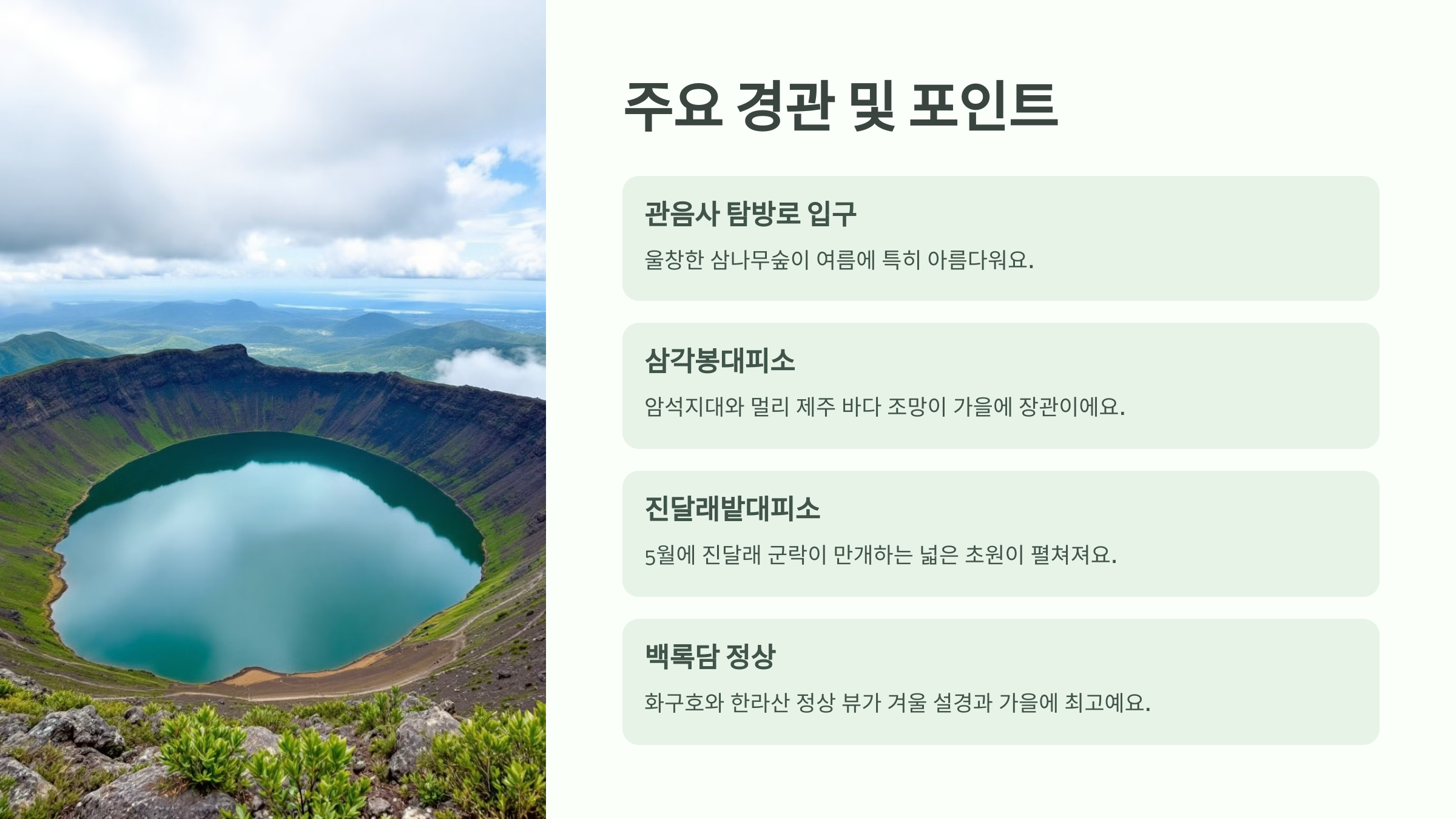 한라산 관음사 코스는 사계절 내내 색다른 매력을 가진 등산로예요. 봄에는 진달래가 만개하고, 여름에는 울창한 숲과 시원한 바람을 느낄 수 있어요. 가을에는 단풍이 절정을 이루고, 겨울에는 설경이 장관을 이루죠. ❄️