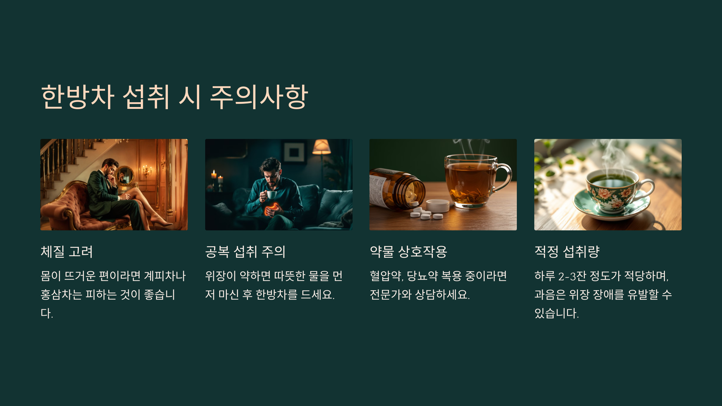 셋째, 약과 함께 섭취할 때는 주의가 필요해요. 특히 혈압약이나 당뇨약을 복용 중이라면 특정 한방차가 약물 작용에 영향을 줄 수 있으므로 전문가와 상담하는 것이 안전해요. 💊